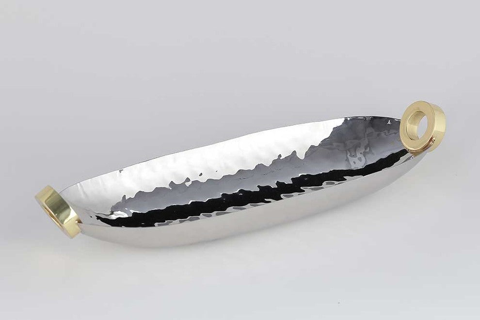 Add function to an ottoman or spruce up a console table with the Nickel Ring Oval Tray, shown here in gold. It features a stylish design that will refresh your space. This piece is made of steel and brass and measures 21 by 3 inches.