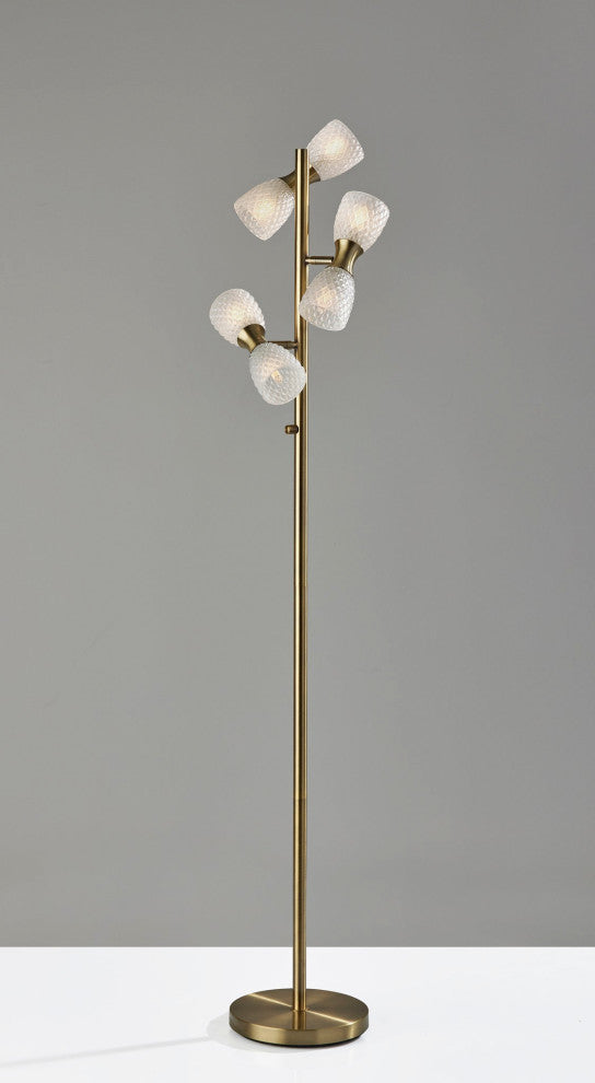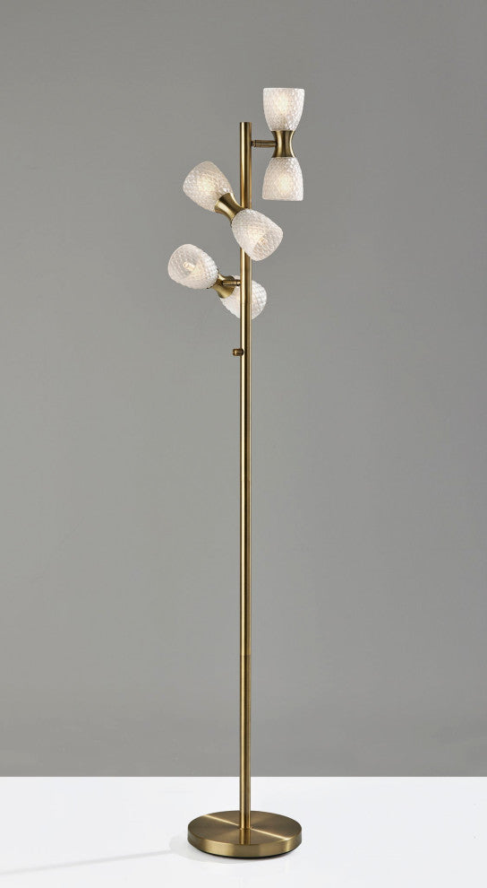 Brighten your space with the style and functionality of the Nina LED floor lamp. Crafted with an antique brass finish and featuring delicate glass texturing, this lamp complements Victorian or farmhouse décor. A 10" diameter round base supports a narrow matching stem. Extending from the stem at offset heights and directions are three dual textured milk glass shades, each with an hour-glass shaped accent piece in antique brass finish. The six included 3W replaceable LED bulbs throw a soft, warm white light and are compatible with full-range dimmers, allowing you to adjust the brightness as needed. For added versatility, the base of each lamp shade features an articulation point, allowing you to rotate and redirect the shades for a variety of looks and lighting options. Complete your décor with the coordinating Nina LED desk lamp and wall lamp.The 3.75" tall and 3.5"diameter glass light shades include delicate texturing for a Victorian feel.An articulation point allows you to rotate and redirect the light shades.The included LED light bulbs are compatible with full-range dimmers, allowing you to adjust the brightness to suit your needs.The included LED lights are rated with CRI of 80, color temperature of 3,000K, and brightness of 275 lumens for a soft, warm white glow.The Nina LED style is also available as a desk lamp and wall lamp.6 x 3W Replaceable & Dimmable G9 LED Bulbs Included