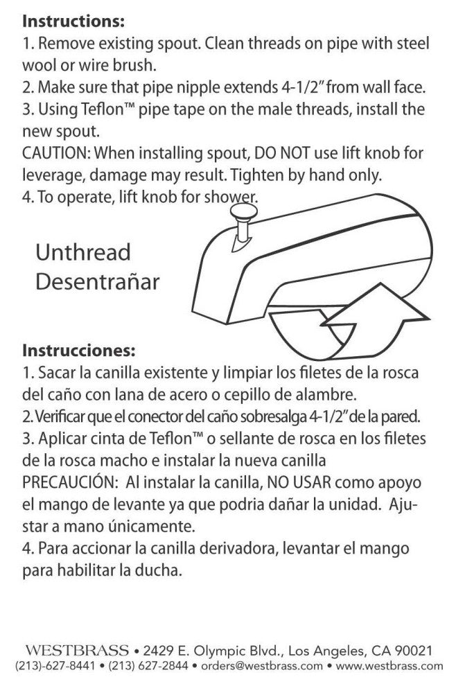 Whether you want to add a new style to your bathtub or replace a rusty older unit, replacing a tub spout is a simple project that can be completed in very little time. Simply choose the finish that works best with your shower. This Westbrass 5-1/2 in. long unit, provides a spout only, with a shower head diverter. Tub spout unthreads by turning counterclockwise from affront mount 1/2 in. IPS pipe nipple. Replacement spout threads back on again, using the 1/2 in. front mount threads.