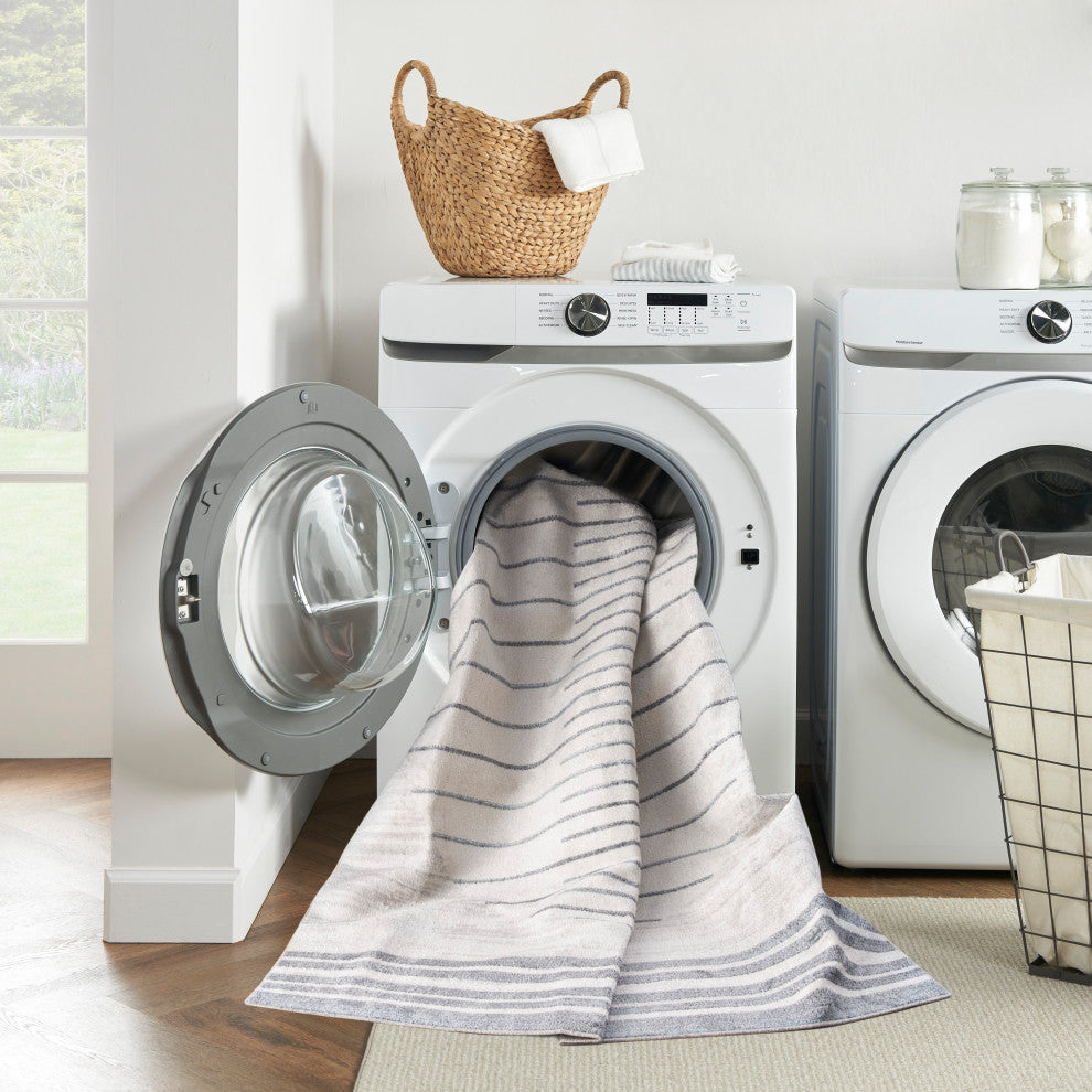 Ground your space in minimalist style with this mid-century modern rug from the Astra Machine Washable Collection. Presented in silver grey and blue, the linear design forms a circular silhouette framed at either end with stripes. This contemporary rug is finished with an eye-catching sheen that shifts under changes in light and is machine-washable for easy care.