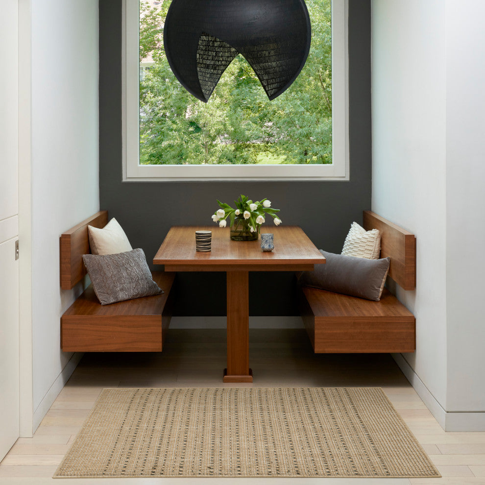 This taupe outdoor rug from the Tulum collection blends geometric style with subtle sophistication. The simple striped pattern is accented with a series of raised, linear weaving coupled with tonal variations that add a unique pop of pattern to your space. This modern rug is flatwoven with a substantial feel and low-maintenance construction great for high-traffic areas both inside and outside.