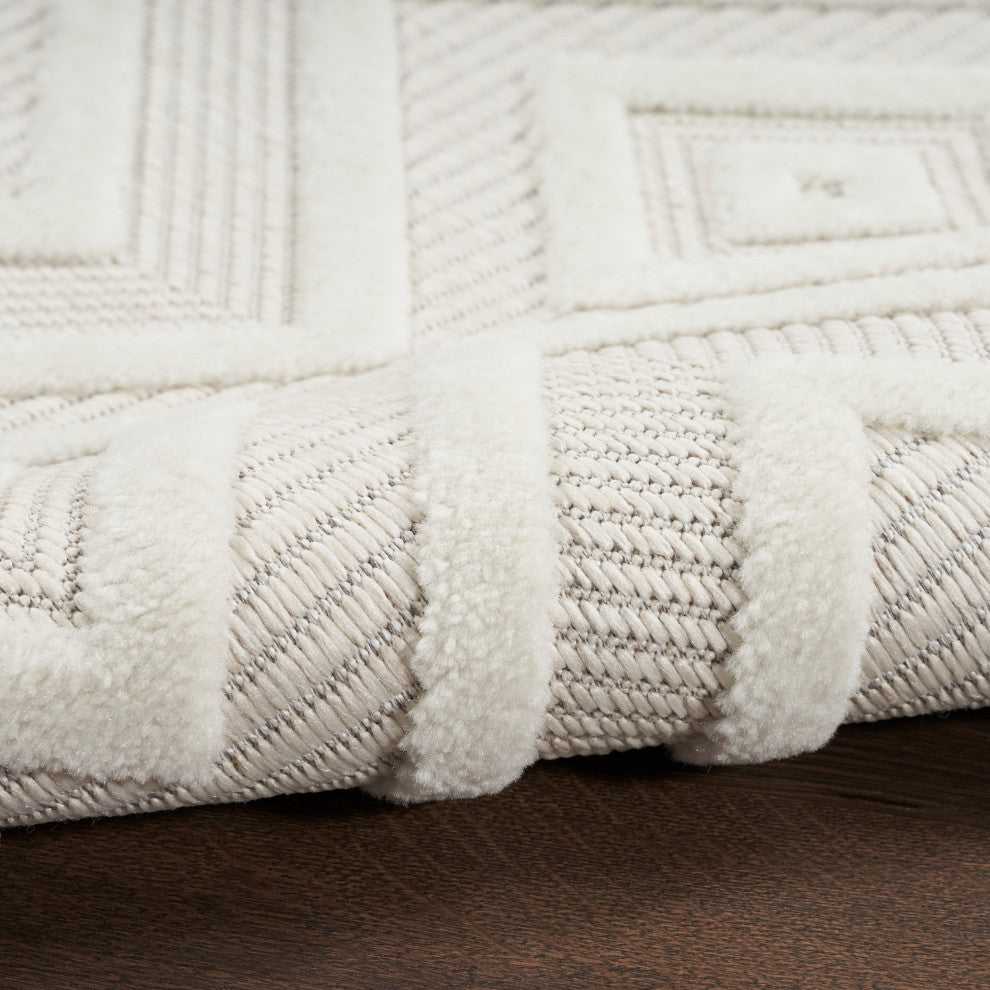This ivory and white Nourison Versatile Collection rug brings inviting style to your favorite indoor or outdoor space. With a raised diamond design that stands out beautifully against its flatwoven ground, this outdoor rug enhances your space with delightful texture and modern appeal. Machine-made from durable, easy-to-clean fibers, Versatile is great for high-traffic areas inside the home as well as all seasons spent outdoors. To care for this rug, we recommend rinsing outdoors with a hose. Air dry both sides fully; do not place into a washing machine.