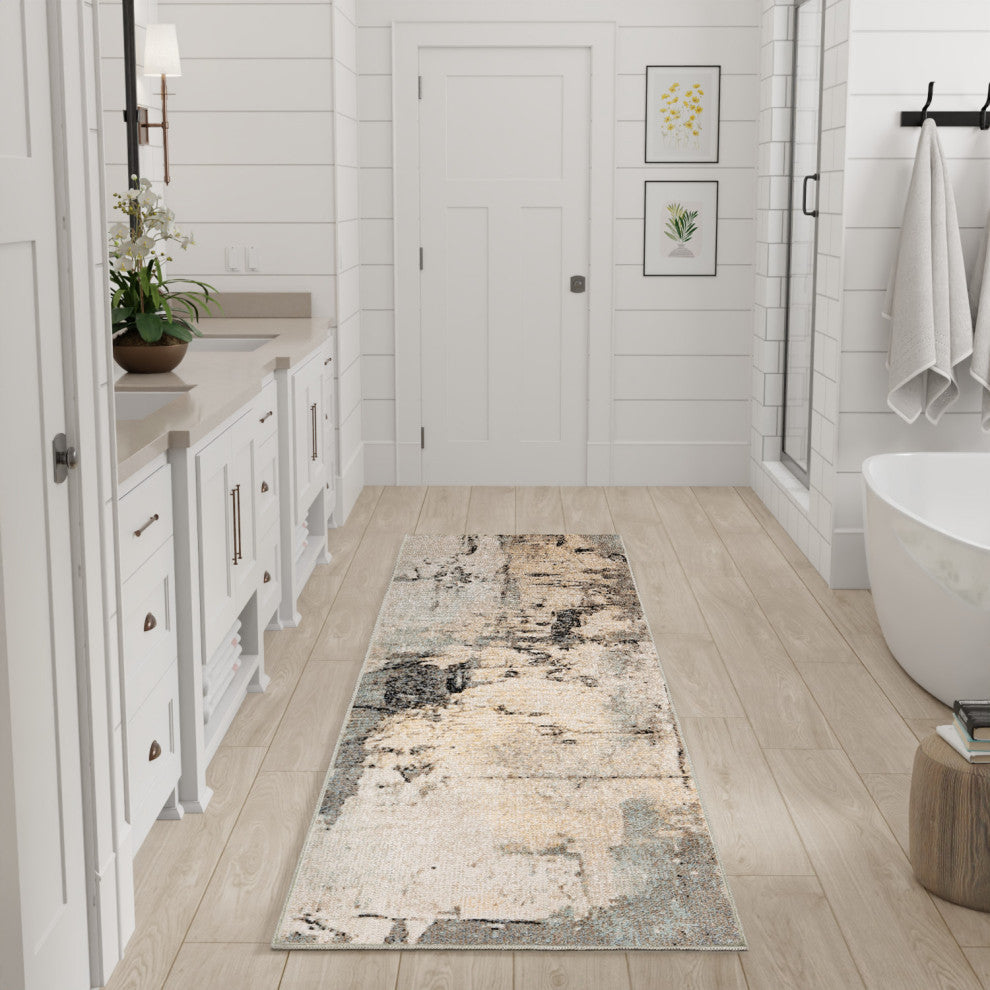 Washable rug with an eye-catching abstract pattern that adds artistic flair