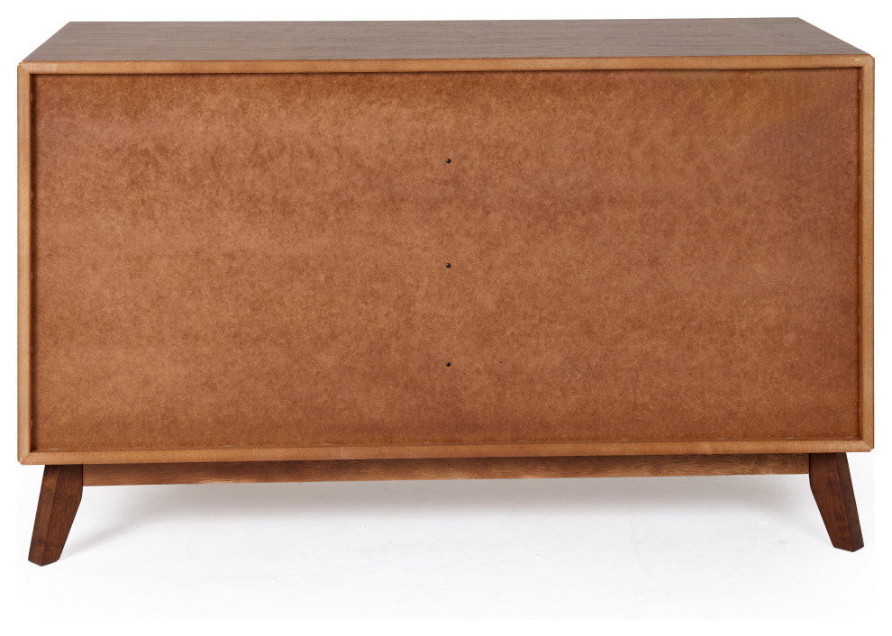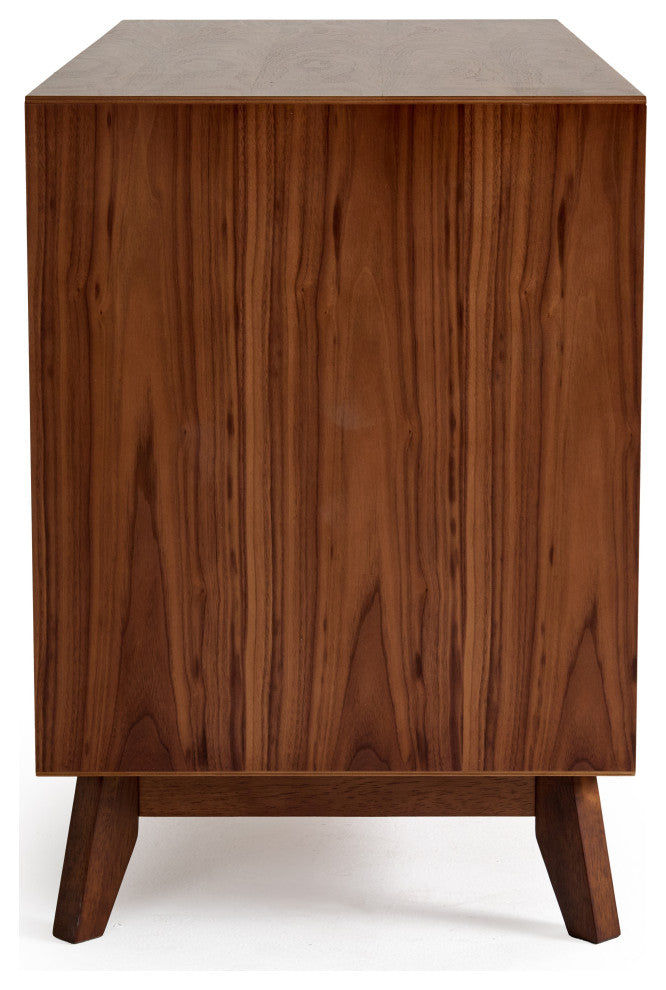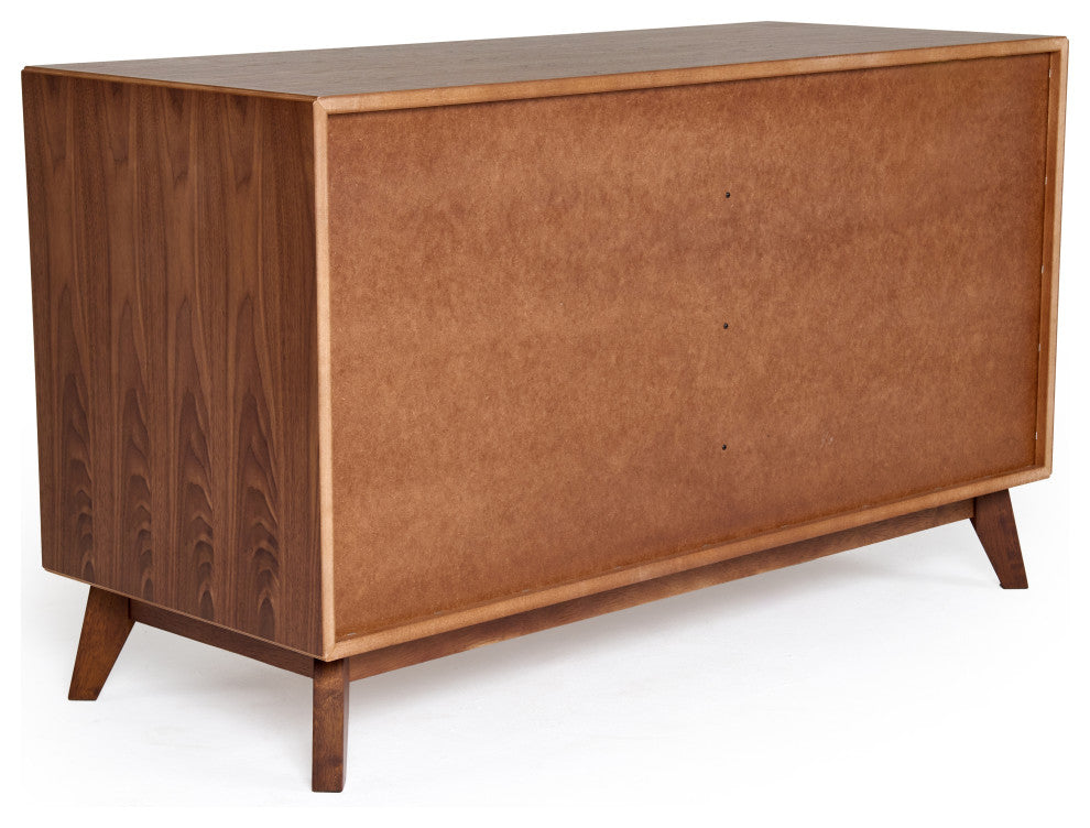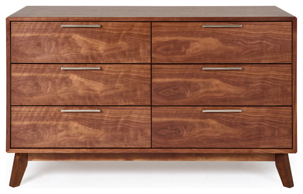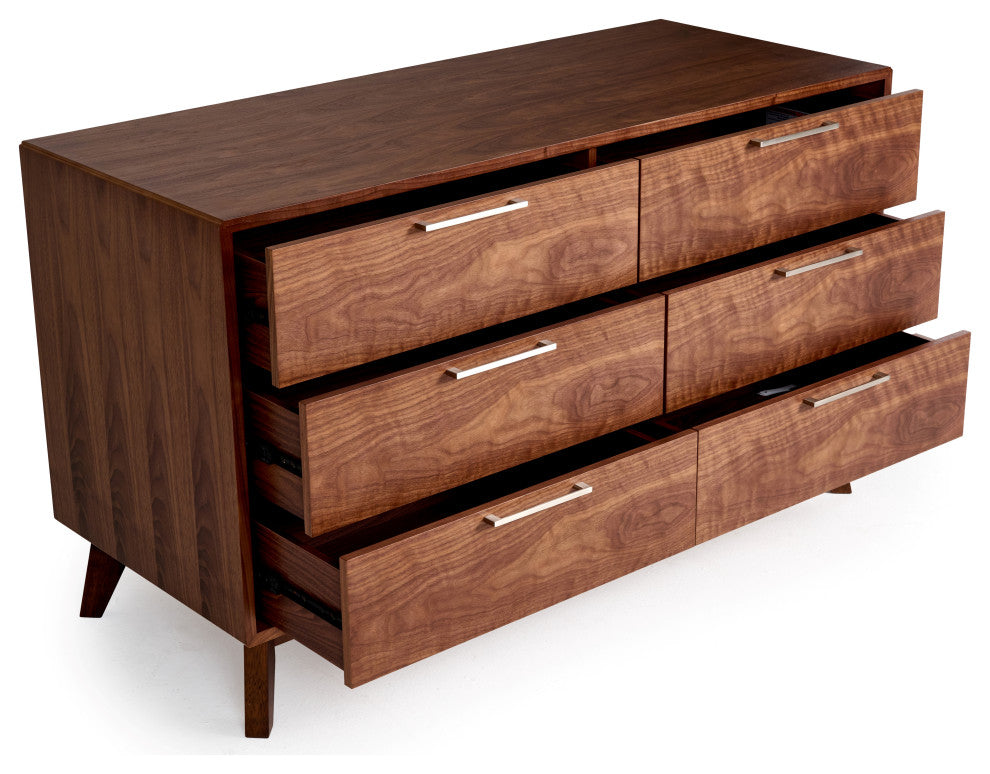 Inspired by classic mid century designs, the Nova Domus Soria Dresser boasts an elegant walnut veneer finish and four tapered feet. It features six drawers for storing clothes or accessories, all with sleek stainless steel handles. Pair with the matching chest and nightstand for a cohesive bedroom aesthetic. In accordance with the Sturdy Act the top drawers for these dressers and chests will not extend all the way to prevent tipping.