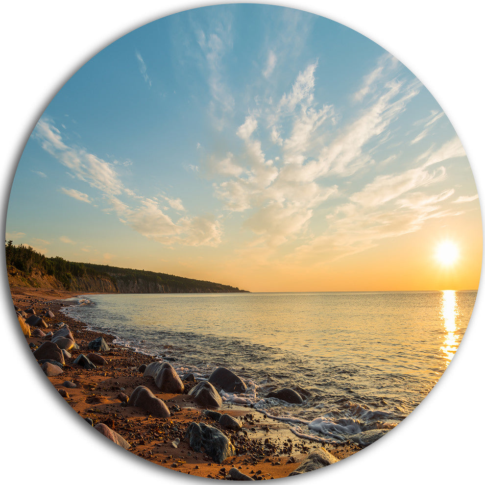 Ocean Shore At Sunrise With Rocks, Seascape Round Metal Wall Art, 36"