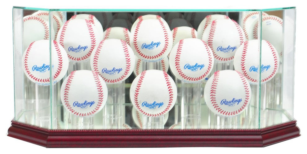 The 10-Ball Baseball octagon display case from Perfect Cases comes with mirror on the bottom and back. This case is UV protect and is supported by Perfect Cases beautiful real wood moulding. Our adhesives contain no acids that may deteriorate signatures. This display case can hold between 10 and 12 autographed baseballs.