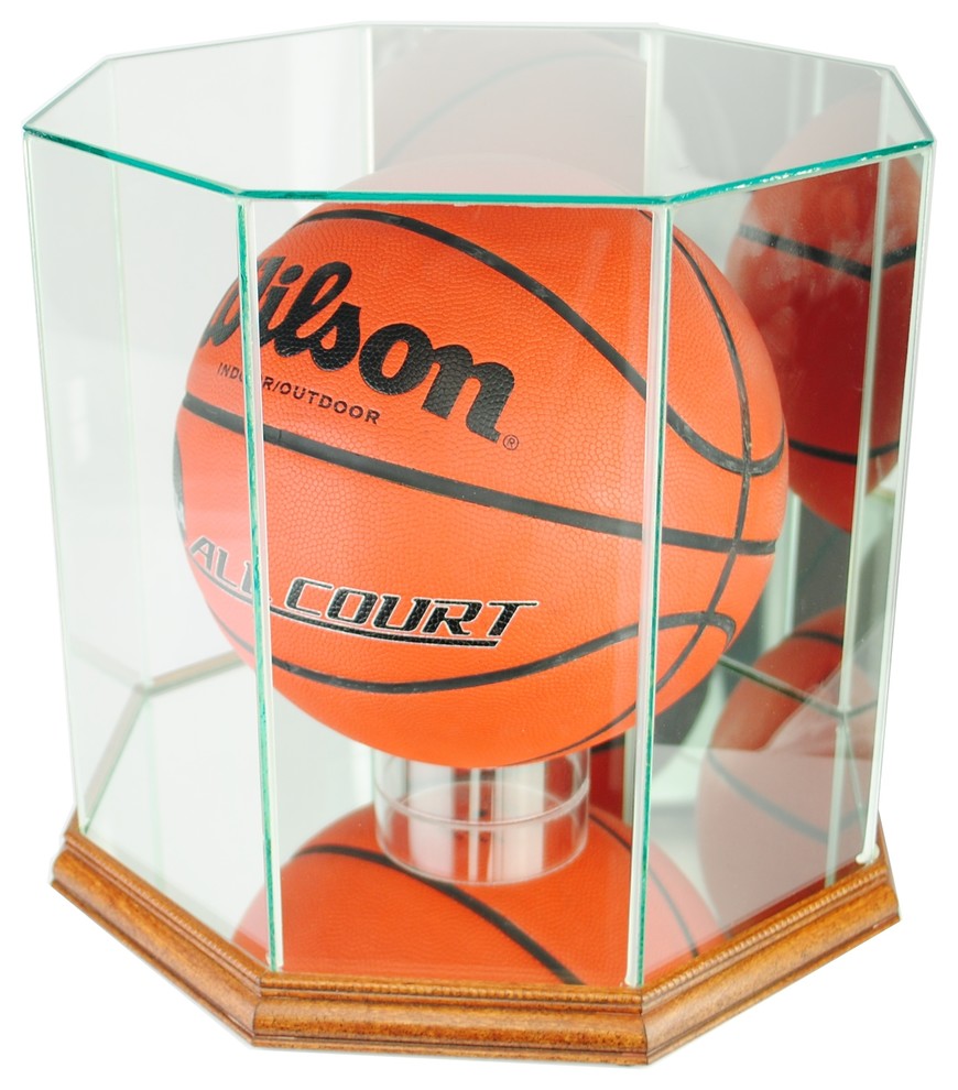 This Octagon Basketball Display Case is a perfect way for you to display your autographed basketball. This basketball display case is made of real UV protected glass and supported by real wood moulding. It is constructed with 8 panels of glass with mirror on the bottom and back. Our adhesives contain no acids that may deteriorate signatures. This display case comes with a clear acrylic basketball holder.