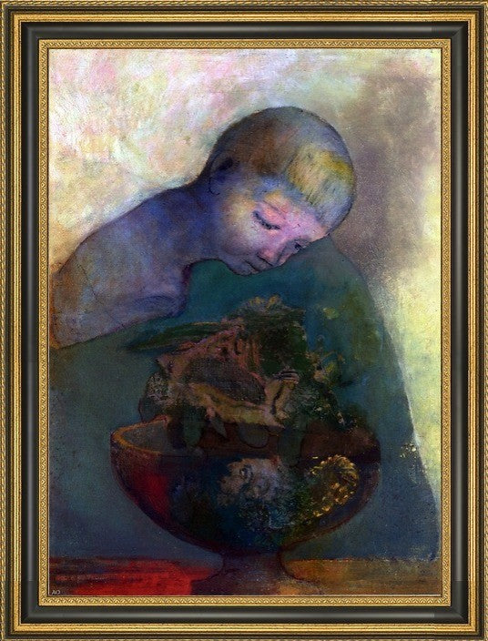18" x 27" Odilon Redon La Coupe du Devenir (also known as L''Enfant a la Coupe) framed premium canvas print reproduced to meet museum quality standards. Our Museum quality canvas prints are produced using high-precision print technology for a more accurate reproduction printed on high quality canvas with fade-resistant, archival inks. Our progressive business model allows us to offer works of art to you at the best wholesale pricing, significantly less than art gallery prices, affordable to all. This artwork is hand stretched onto wooden stretcher bars, then mounted into our 3 3/4" wide gold finish frame with black panel by one of our expert framers. Our framed canvas print comes with hardware, ready to hang on your wall. We present a comprehensive collection of exceptional canvas art reproductions by Odilon Redon.