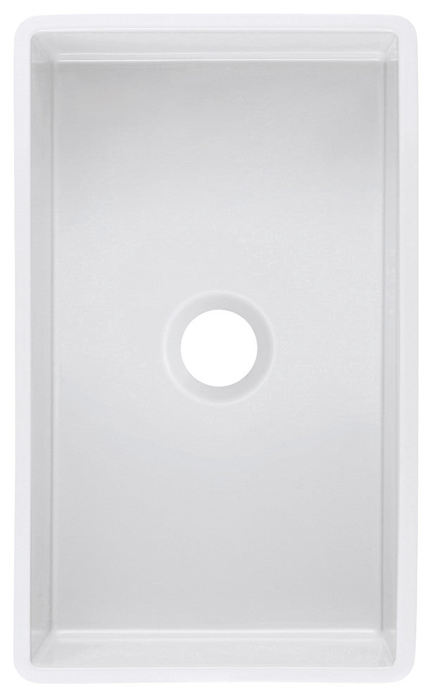 The Olde London Farmhouse Sink is a stylish and practical addition to any kitchen. The bright white color is easy to incorporate into your current decor theme. The deep basin allows you to easily wash large pots and pans, while the three-sided bevelled frame adds a touch of sophistication.Smooth apron on opposite sideStandard 3-1/2" drain opening (centered) Grid included Bowl depth (inside height): 9"Inside width: 31" Inside length: 16"Disposal/ strainer with extended flange is recommended