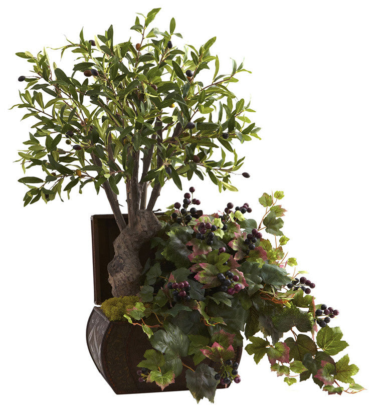 Sometimes, one''s imagination just runs wild. That''s the case with this eclectic Olive Tree & Grape Leaf arrangement. With a small, thick olive tree in the background, the soft, colorful grape leaves billow forth. All of this color and texture is placed in an ornate chest planter, giving it a one-of-a-kind look that has to be seen to be believed. Enhances any home or office decor, and makes a unique gift as well.