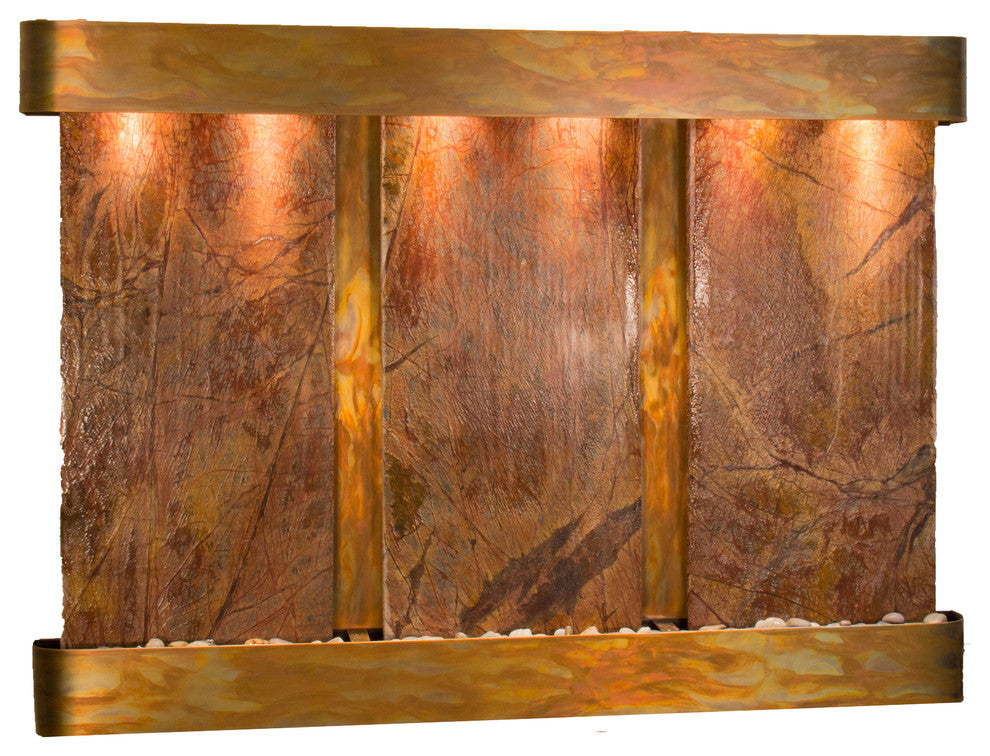 The Olympus Falls water fountain by Adagio Water Features is a beautiful three panel water wall that comes in slate, marble, mirror, or FeatherStone. This wall water fountain is self-contained allowing you to place it anywhere there is a standard 110V outlet without needing a water source. Just pour water into your tray and the pump will cycle it through. Enjoy the calming effects of a water fountain in your home today.75" L x 54" H x 6" D, easy to hang, complete with colored instructions and hardware for hanging on a sheetrock wall. Hanging Weight 465 lbs.This unit includes: 6 halogen lights Polished river rocks 3 Electric pumps3-way pull chain that allows you to run just lights, just water, or lights and water. Welded plastic liner insures against leaking and unique water distribution unit system will not clog. 110V, 100W; one cord operates entire unit; 90 degree plug can be concealed behind water feature. Durable powder coat finish; Manufactured and assembled in the USA with a 1 year limited warranty. • All marbles are natural and may differ in color and texture from the picture shown due to their natural uniqueness.