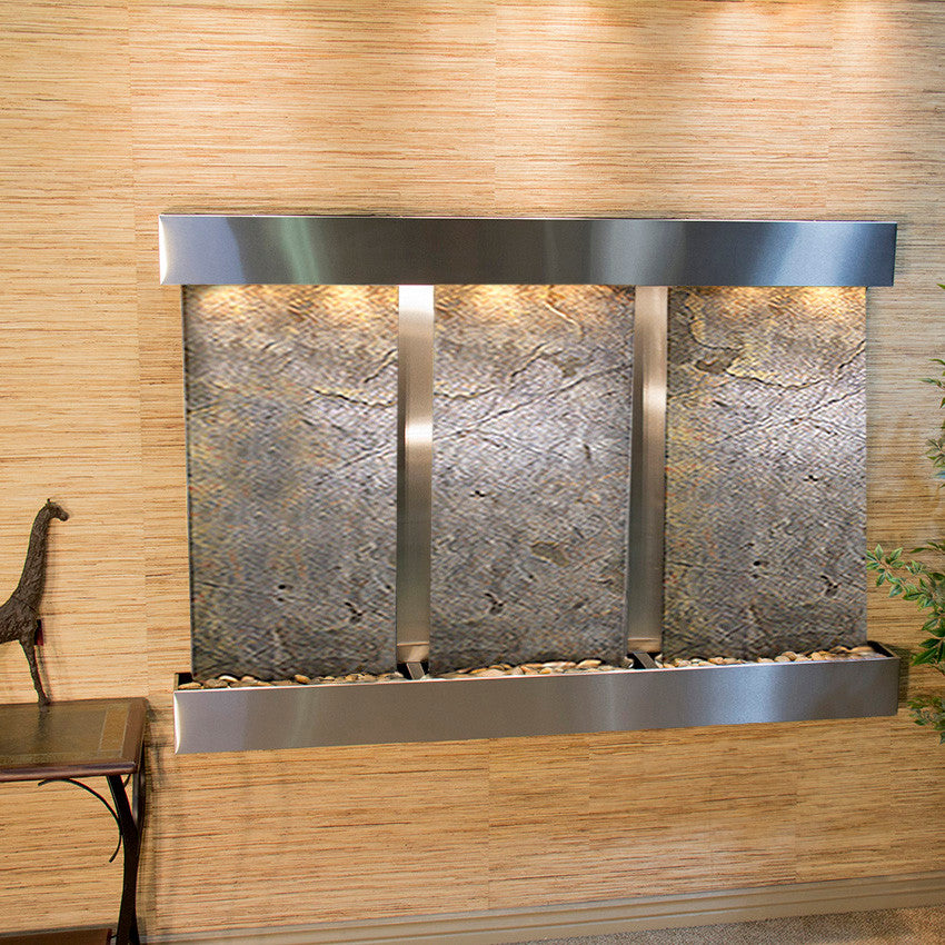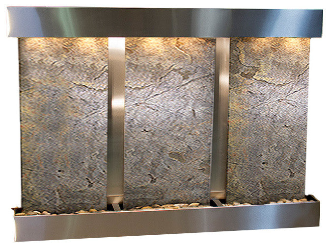 The Olympus Falls water fountain by Adagio Water Features is a beautiful three panel water wall that comes in slate, marble, mirror, or FeatherStone. This wall water fountain is self-contained allowing you to place it anywhere there is a standard 110V outlet without needing a water source. Just pour water into your tray and the pump will cycle it through. Enjoy the calming effects of a water fountain in your home today.75" L x 54" H x 6" D, easy to hang, complete with colored instructions and hardware for hanging on a sheetrock wall. Hanging Weight 180 lbs.This unit includes: 6 halogen lights Polished river rocks 3 Electric pumps3-way pull chain that allows you to run just lights, just water, or lights and water. Welded plastic liner insures against leaking and unique water distribution unit system will not clog. 110V, 100W; one cord operates entire unit; 90 degree plug can be concealed behind water feature. Durable powder coat finish; Manufactured and assembled in the USA with a 1 year limited warranty. • This light-weight slate veneer known as FeatherStone is natural stone and therefore may differ in color and texture from the photos shown.