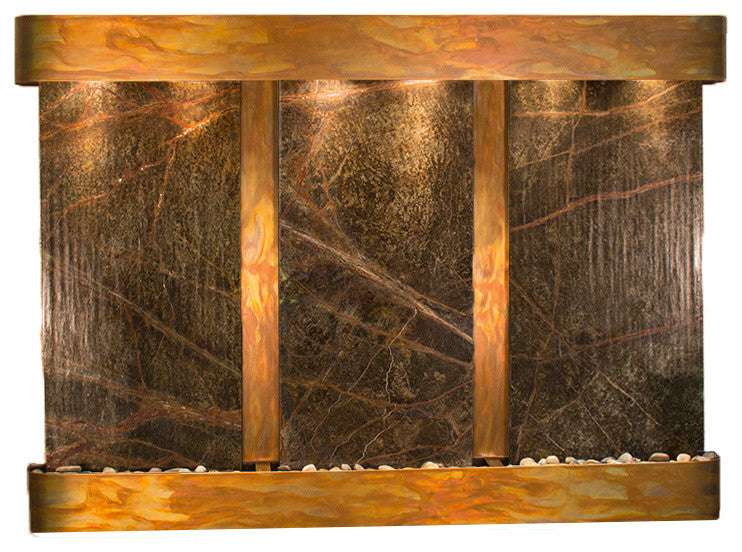 The Olympus Falls water fountain by Adagio Water Features is a beautiful three panel water wall that comes in slate, marble, mirror, or FeatherStone. This wall water fountain is self-contained allowing you to place it anywhere there is a standard 110V outlet without needing a water source. Just pour water into your tray and the pump will cycle it through. Enjoy the calming effects of a water fountain in your home today.75" L x 54" H x 6" D, easy to hang, complete with colored instructions and hardware for hanging on a sheetrock wall. Hanging Weight 465 lbs.This unit includes: 6 halogen lights Polished river rocks 3 Electric pumps3-way pull chain that allows you to run just lights, just water, or lights and water. Welded plastic liner insures against leaking and unique water distribution unit system will not clog. 110V, 100W; one cord operates entire unit; 90 degree plug can be concealed behind water feature. Durable powder coat finish; Manufactured and assembled in the USA with a 1 year limited warranty. • All marbles are natural and may differ in color and texture from the picture shown due to their natural uniqueness.