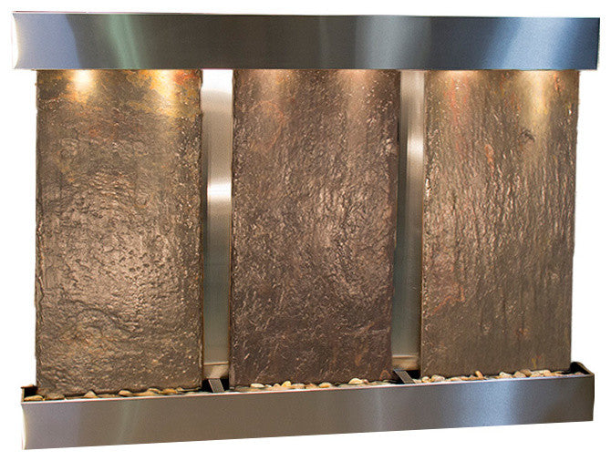 The Olympus Falls water fountain by Adagio Water Features is a beautiful three panel water wall that comes in slate, marble, mirror, or FeatherStone. This wall water fountain is self-contained allowing you to place it anywhere there is a standard 110V outlet without needing a water source. Just pour water into your tray and the pump will cycle it through. Enjoy the calming effects of a water fountain in your home today.75" L x 54" H x 6" D, easy to hang, complete with colored instructions and hardware for hanging on a sheetrock wall. Hanging Weight 465 lbs.This unit includes: 6 halogen lights Polished river rocks 3 Electric pumps3-way pull chain that allows you to run just lights, just water, or lights and water. Welded plastic liner insures against leaking and unique water distribution unit system will not clog. 110V, 100W; one cord operates entire unit; 90 degree plug can be concealed behind water feature. Durable powder coat finish; Manufactured and assembled in the USA with a 1 year limited warranty. • All slates are natural and may differ in color and texture from the picture shown due to their natural uniqueness.