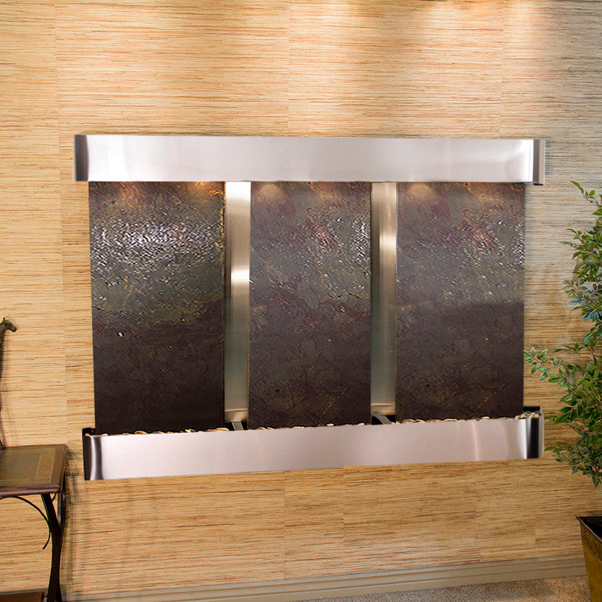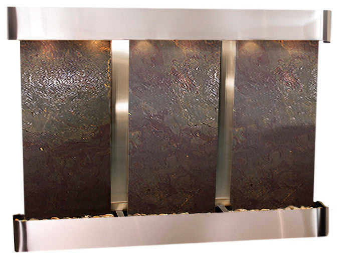 The Olympus Falls water fountain by Adagio Water Features is a beautiful three panel water wall that comes in slate, marble, mirror, or FeatherStone. This wall water fountain is self-contained allowing you to place it anywhere there is a standard 110V outlet without needing a water source. Just pour water into your tray and the pump will cycle it through. Enjoy the calming effects of a water fountain in your home today.75" L x 54" H x 6" D, easy to hang, complete with colored instructions and hardware for hanging on a sheetrock wall. Hanging Weight 180 lbs.This unit includes: 6 halogen lights Polished river rocks 3 Electric pumps3-way pull chain that allows you to run just lights, just water, or lights and water. Welded plastic liner insures against leaking and unique water distribution unit system will not clog. 110V, 100W; one cord operates entire unit; 90 degree plug can be concealed behind water feature. Durable powder coat finish; Manufactured and assembled in the USA with a 1 year limited warranty. • This light-weight slate veneer known as FeatherStone is natural stone and therefore may differ in color and texture from the photos shown.