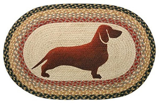 Dachshund Oval Rug 20"x30". Made in Bangladesh from 100% Natural Jute which is Biodegradeable & Eco-Friendly. Jute is also one of the strongest fibers known to man. Clean with mild soap and cold water. Do not machine wash. Design is Hand Stenciled.