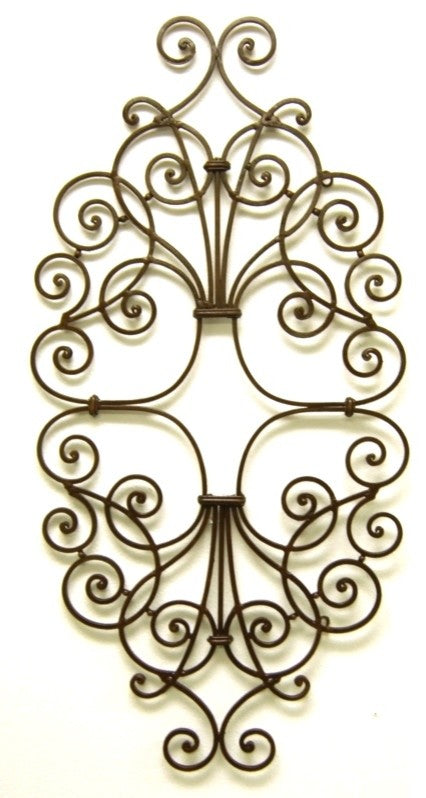 Our open wall grille will add elegance wherever you put it. Use just one on a wall or column, or use multiples framing a door or in a group for dramatic effect. Can be used indoors or outdoors. - Size: 41. 75" H x 20. 25" W x 1" deep. May be hung vertically or horizontally- Materials: Premium Handcrafted iron with rust brown finish. Use indoors or outdoors. - Finish: Hooks on back for hanging vertically or horizontally. - Heirloom Quality - Expertly hand crafted and hand finished. Due to the hand crafted nature of this piece, each piece may have subtle differences.