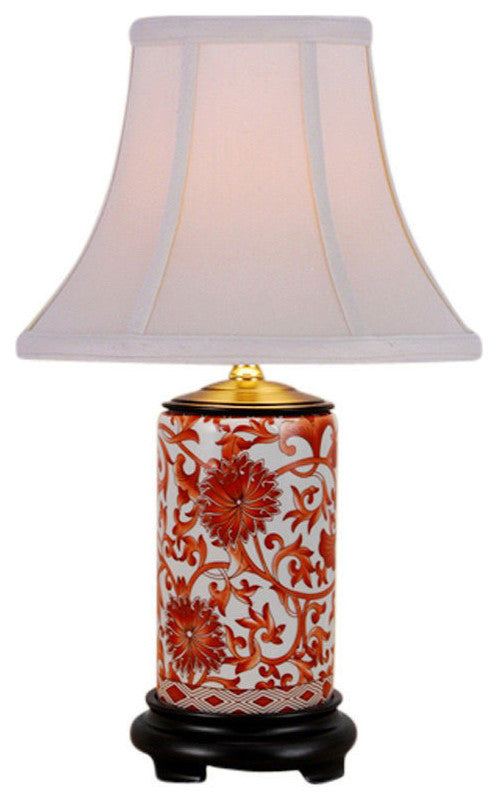 We are Asian Style Furnishing and we are here to help you add beautiful Asian colors and history to your home. We speciallize in porcelain items as well as creating fantastic lighting with our pieces. All of our items are for decorative use only not good for food storage. All of our items are for decorative use only not good for food storage. We have been in business for over 30 years and I am the second generation to be in this business. I am excited to bring my energy and family experience to those in need of some Eastern influences in their home. Please note : As most of our porcelain pieces are hand made and hand painted they may be slightly different from the photo in both shape and the way it is even colored! We do our best to find the one that is most common but sometimes they will be slightly different. Orange and White Coral Porcelain Cylindrical Vase Table Lamp 15" Country of Origin: China Dimensions (in inches): Height: 15" Length: 9" Depth:9" With shade Watts:25 Number of Bulbs: 1 UL LISTED: YES Bulbs Not Included Comes with Shade and Finial