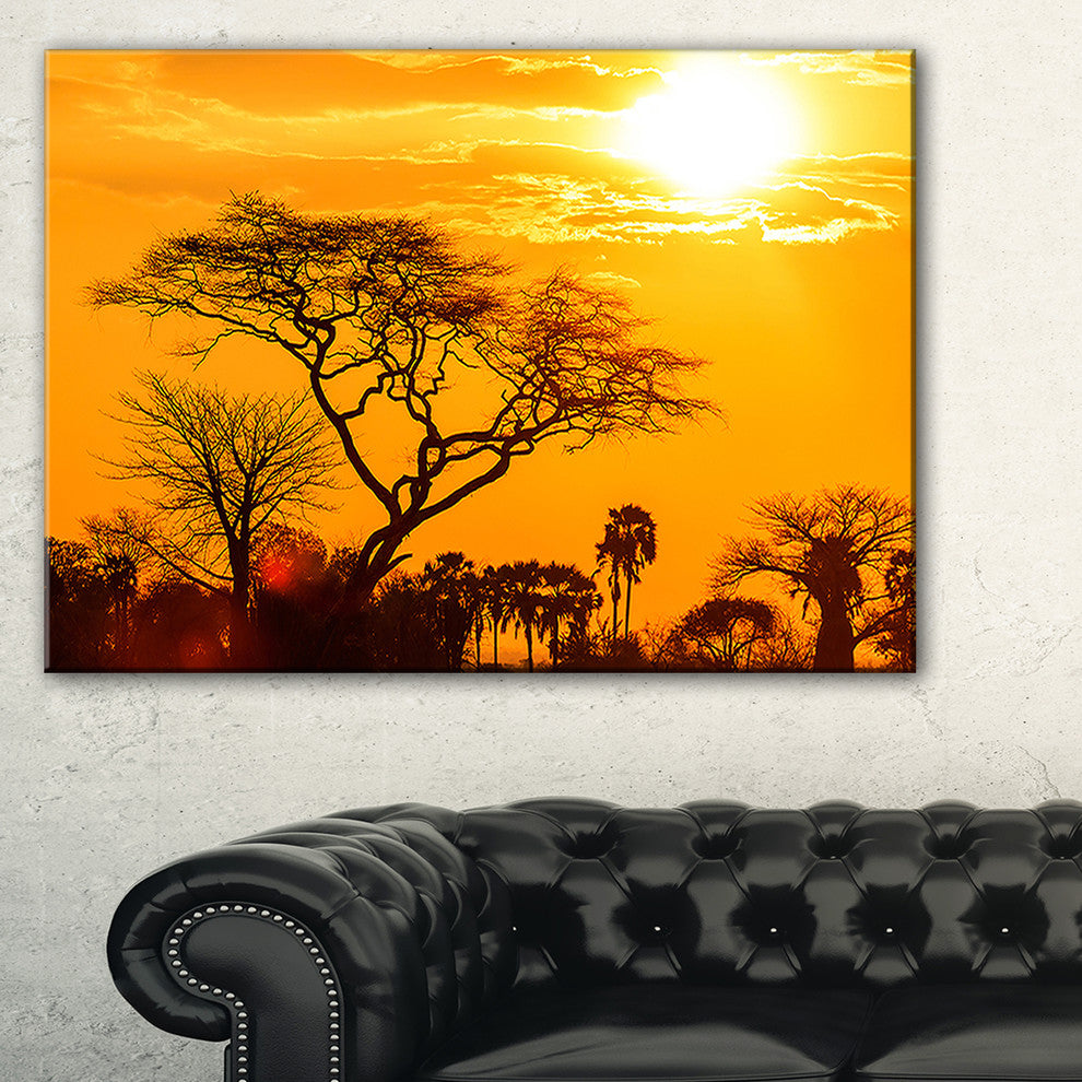 The Orange Glow of African Sunset canvas art print is sure to make an impression on anyone who sees it. This artwork is gallery wrapped around a 1-inch solid wood frame and arrives carefully packaged and entirely ready to hang on the wall. Design Art only uses the highest resolution and pigments to ensure a crisp colorful print that is never faded or pixelated. This artwork is sure to be a conversation starter in any home or office.