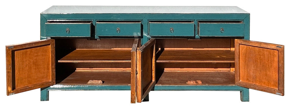 This versatile Distressed Teal Chinese-Inspired Sideboard is a must-have for any home. The rich teal finish and distressed details create a sophisticated and elegant look. Whether used as a dining room sideboard, living room buffet, or entryway console, this piece offers ample storage space and style. This is a piece that will elevate the look of any room and become a treasured addition to your home.Dimensions: w72" x d16.25" x h31.5" , inside w34" x d13" x h18" each sideOrigin: ChinaMaterial: Elm WoodCondition: hand-made, wood joint lines, rustic finishWork: ship in one pieceUS domestic continental buyer of 48 states pays $595 shipping charge for curbside delivery. Customer from Hawaii, Alaska, US Island, Florida Keywest, and Canada pays extra shipping costs. Insurance and handling charges are already included in the shipping cost. In-store pick-up is highly welcomed if you are in San Francisco Bay Area. (No charge) White-Glove (4-8 weeks transit) service can be arranged with an additional cost.For customer who is looking to buy multiple items. We can either combine "œseveral items on the same pallet "œor "œinclude small items inside the largest item as long as it fits in"�When your shipment is delivered, carefully inspect the outside of the packaging before the delivery personnel leave. It is important to clearly indicate if there is any visible damage to the packaging or items on the delivery paperwork. Carriers usually do not honor concealed damage claims so it is crucial to clearly indicate any visible damage to the packaging or items on the delivery paperwork.