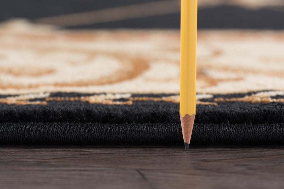 Blanket your floors in the traditional beauty of the Orleans Traditional Area Rug. This stunning rug features an intricate fleur de lis pattern with a scroll border in vibrant jet black, fawn beige and brass. Polypropylene fibers make this rug easy to care for and naturally stain-resistant perfect for high traffic areas, large kitchens or even under the family dining table.Care instructions: Vacuum to restore pile; spot clean with mild detergent and water when necessary; do not bleach.Color: BlackMaterials: Power loom machine-made polypropyleneDimensions: W 5''3" x D 7''3" OvalPlease Note: Due to differences in computer monitors, some product colors may vary slightly.
