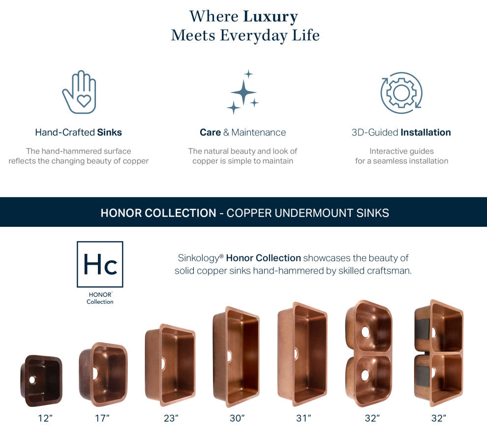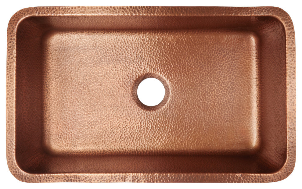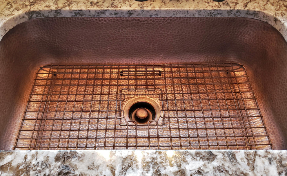 When it comes to cleaning your kitchen, you want it to be as easy as possible. The Orwell undermount copper kitchen sink makes cleaning up easy - ensuring crumbs and moisture go in the sink, not in a seam. The single bowl design allows maximum workspace for cleaning bulky or oversized dishes. Our durable, solid copper sinks are hand-hammered by skilled craftsman and protected by our lifetime warranty.Dimensions: 30" x 18" x 8"Undermount style creates a seamless transition from sink to countertop and ensures crumbs and moisture easily go in the sinkSingle bowl maximizes available spaceHand-hammered, solid 16-gauge copper is protected by our lifetime warrantySound dampening pads reduce dish clatter, noise, and vibrationsAntique Copper is aged to a medium-to-light tone for that classic copper lookRecommended Products: Wren Kitchen Sink Bottom Grid in Antique Brown (#SG004-27)Kitchen Sink Basket Strainer Drain in Antique Copper (#TB35-01)Kitchen Sink Disposal Drain Flange in Antique Copper (#TD35-01)Copper Care IQ Kit (#SARMOR-101)