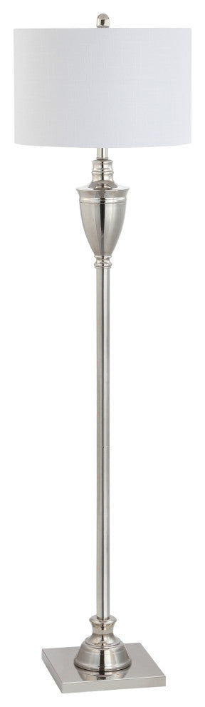 Classical style meets contemporary elegance in this polished nickel floor lamp with a bright white drum shade. Typically used as a silhouette for table lamps, the Grecian urn accent adds an old world element to this functional silhouette. At 62" tall, it is the perfect height for beside a sofa or between a pair of club chairs. Features:A Grecian Urn accent adorns the base of this classic floor lamp100% cotton hardback drum shadeBeautiful to display or easy to conceal: the 72" cord is silk-wrappedOn-off rotary switch on socketEco-friendly 9W LED bulb includedTakes one bulb and compatible with any 12W LED or 100W Type "A" or 23W CFLUL ListedColor: Polished Nickel with white shadeBody Material: MetalBase Material: IronFinial Material: MetalFinial Color: Polished NickelHarp Color: SilverIncludes: One (1) lamp(s)Minor Assembly RequiredDimensions:Lamp: 62 inches high x 16 inches wide x 16 inches deepShade: 10 inches high x 16 inches wide x 16 inches deepAbout us:You see a lamp.We see a decorative work of art.A perfectly curved shade casts a dramatic shadow on a floor. A silk cord you never want to hide. LED lightbulbs: as easy on the environment as they are on the eyes. The JONATHAN Y Lighting collection considers every detail from impeccably sourced materials to designer styling. And our prices are so attractive, we''ve transformed a functional necessity into a fashion accessory.JONATHAN Y Lighting - a fashion revolution in home decor.