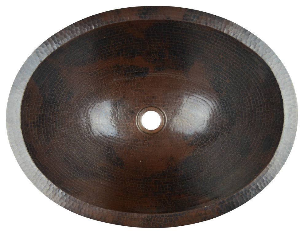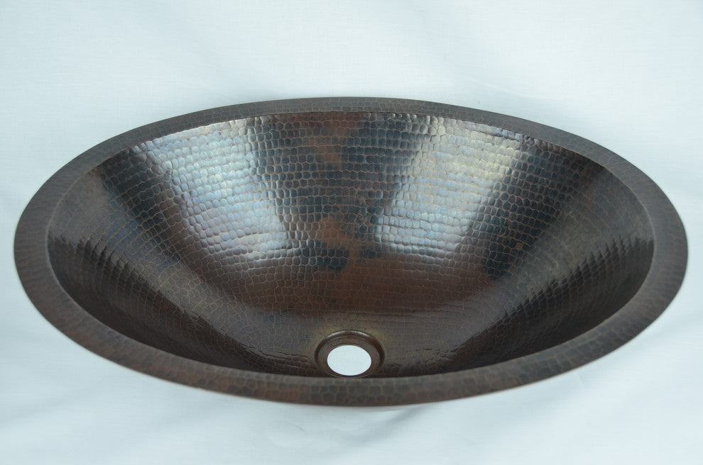 Oval 21" Undermount • 21" x 16" Lip to Lip • 6" Deep • 19" x 14" Inside • Handmade copper sink • 100% Copper • Oil rubbed finish • Made in Mexico No long waits for your beautiful handmade copper sink to arrive. Sinks are already in the U.S, they were shipped directly from our shop in Mich, Mexico. Tesoro Tarasco"™s hammered copper sinks are made from recycled copper. The patina is naturally made by a fire processing, and changes overtime.When you buy a copper sink from TESORO TARASCO, you''re not only getting a unique handmade copper sink, at the same time you''re supporting an activity that has been taking place for hundreds of years. The Purepechas (natives of the state) from the state of Mich, Mexico, have been working with copper and other metals for a centuries and have been passed down from father to son for generations. A typical copper sink takes several days and many thousands of hammer strikes to create. When you purchase from us, you''re not only buying a beautiful sink, you''re also getting a product with an ancient technique. FUN FACT!!!!A huge advantage of a copper sink is the natural antibacterial properties of copper. The EPA (Environmental Protection Agency) has confirmed that copper is the first solid metal to possess antimicrobial properties effective in killing harmful bacteria living on touch surfaces.THANKS FOR YOUR VISIT AND THANKS FOR HELPING TO KEEP THIS TRADITION ALIVE, BY BUYING OUR PRODUCTS.