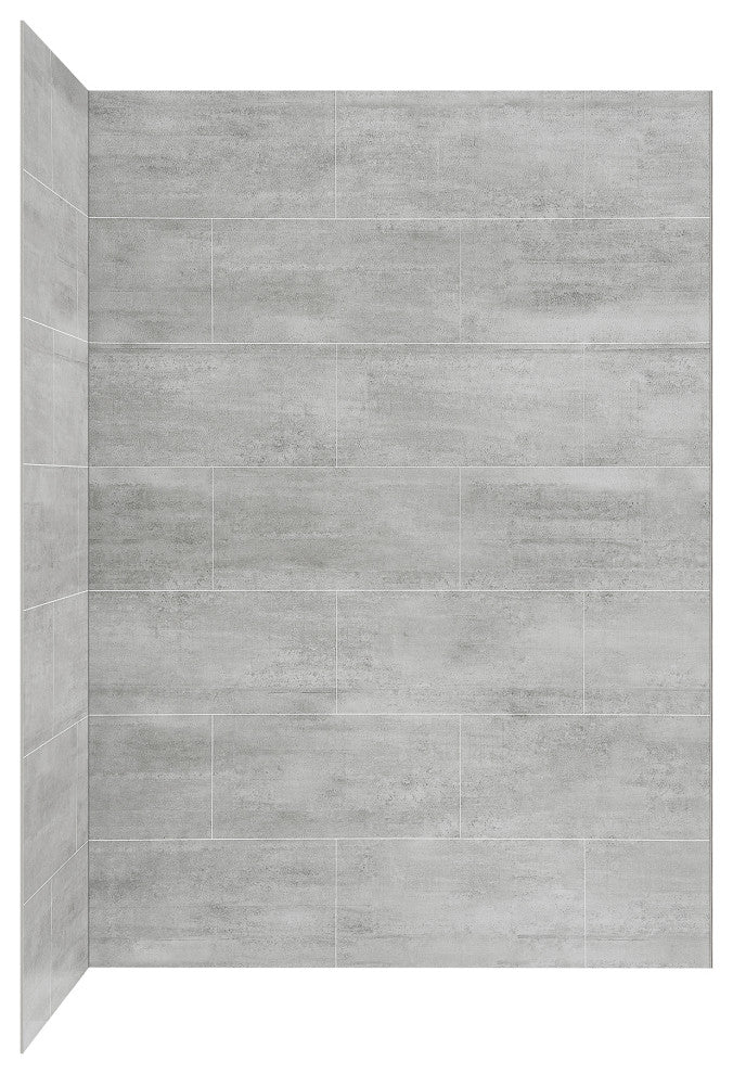 3-piece wall set for the misty 48 in. corner shower kit, featuring an all-over horizontal grey tile pattern