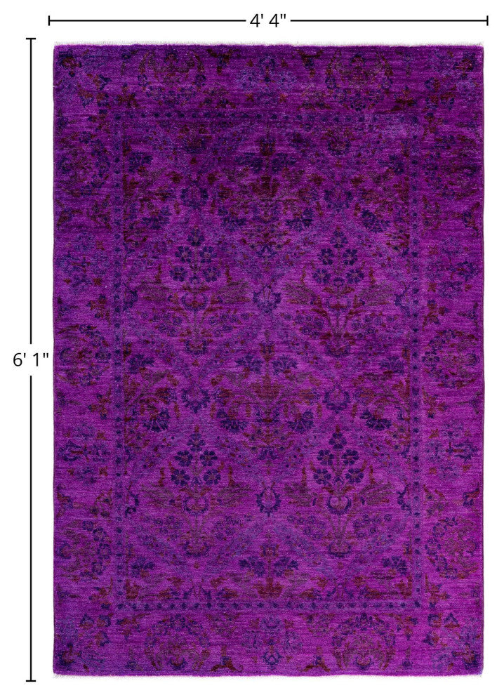Overdyed area rugs blend vintage charm with bold, modern colors. This process involves taking distressed or faded traditional and antique rugs and saturating them with vibrant, monochromatic dye. This technique enhances the texture of the rugs while preserving the intricate patterns underneath. The result is a striking combination of old and new, with rich hues like deep blue, purple, or bright red. These rugs are perfect for eclectic and contemporary spaces, adding an artistic touch and serving as a dynamic focal point in any room.FeaturesHandcrafted by our team of experts in PakistanExceptional durability with 100 knots per inch constructionConstructed of 100% wool for a soft and cozy feelConvenient 4'' 4" x 6'' 1" dimensions offer the perfect balanced and inviting rug presenceNote that slight color variations may occur due to monitor differences. Embrace the individuality of each rug with minor variations in lengths, widths, and patternsDimensions:Area RugLength: 73 inchesWe believe that a beautiful room starts from the ground up. That is what inspired our founders to start selling hand-knotted rugs over 40 years ago. Since then, our passion for well-designed, impeccably hand-made rugs has never wavered.Experience - With more than 40 years in the rug business, our knowledge of premium hand-knotted rugs is exceptional.Quality - Our focus is on hand-knotted rugs and only hand-knotted rugs. At a minimum, it takes months to complete each rug by hand - that level of workmanship means our rugs are made to last.Variety - Our selection includes styles, sizes, and colors for every space and taste.