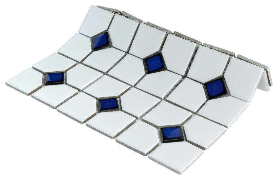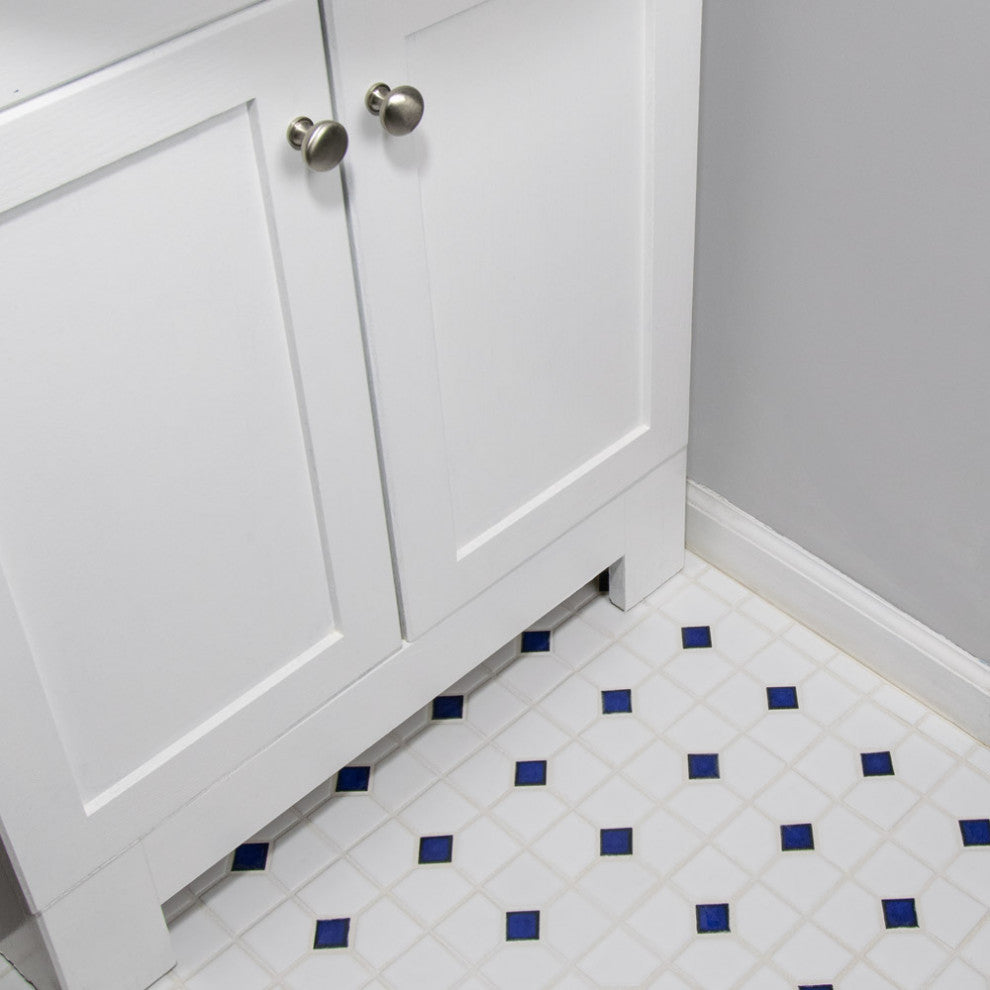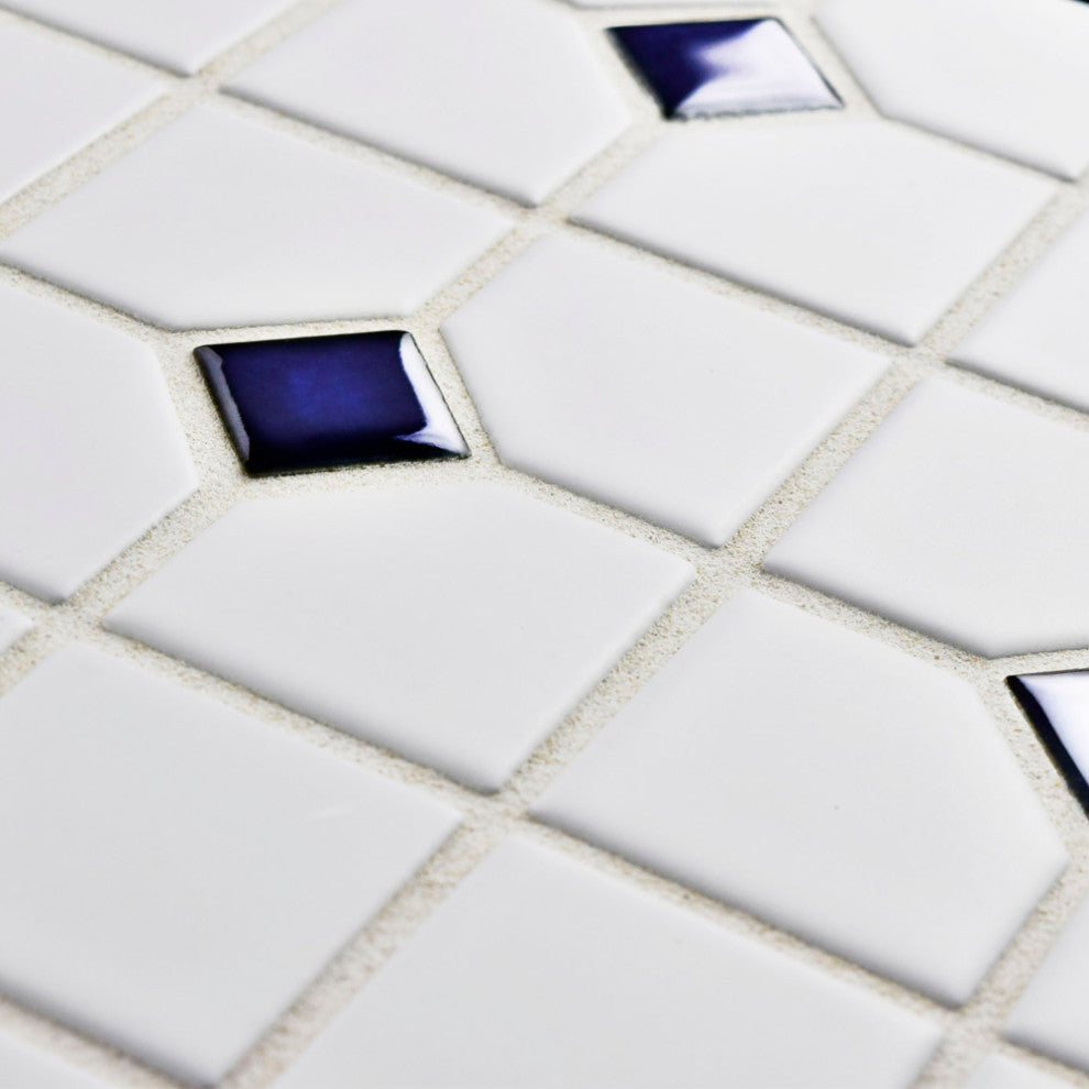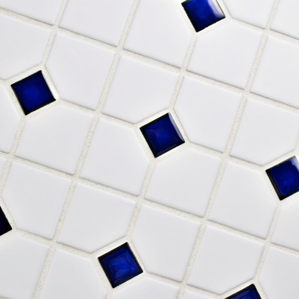 Our Oxford Matte White with Cobalt Dot Porcelain Mosaic Tile offers a traditional look that will fit within any design scheme. The soft matte finish on the white background and glossy finish on the cobalt blue diamonds exudes a classic look that never goes out of style. This mosaic tile has a mesh backing for easy installation. With a water absorption rating of less than 0.5%, this tile is a fit for any space including moisture-heavy or outdoor areas.