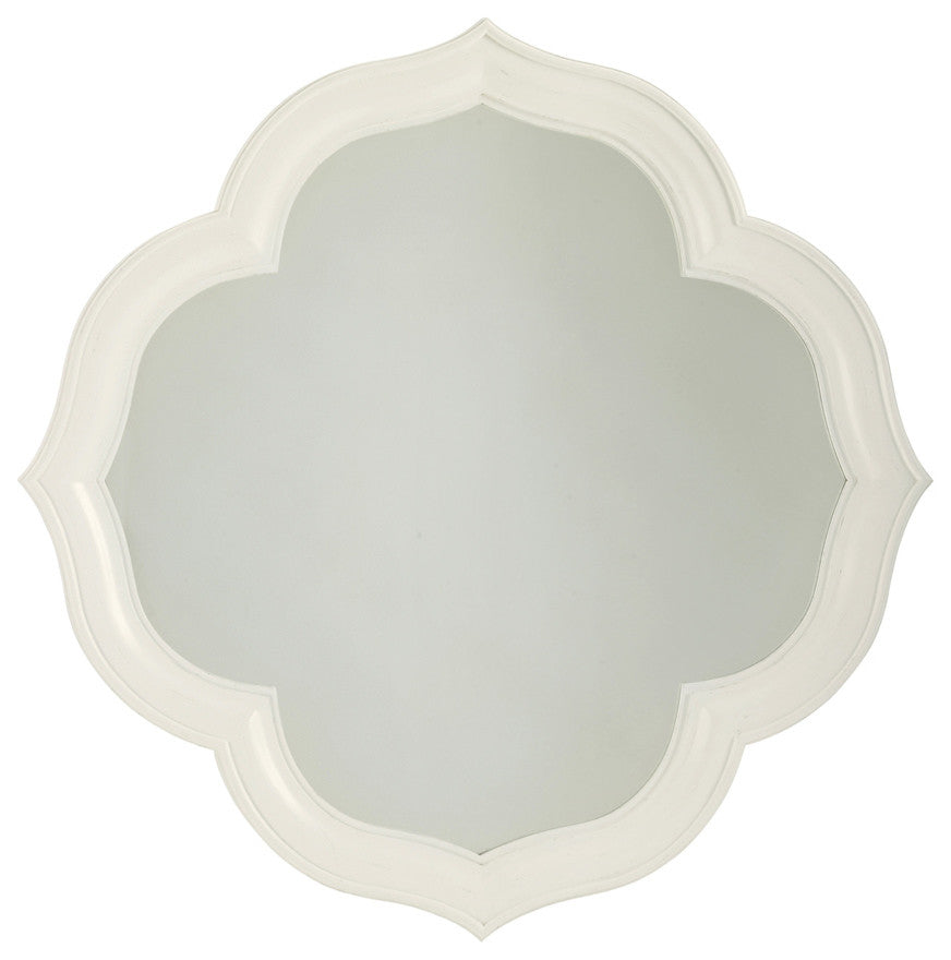 A distinctive quadrefoil-and-diamond pattern is used as a recurring design theme throughout the Ivory Key collection. The mirror is a direct representation of this symmetrical shape formed by partially overlapping circles of the same diameter.