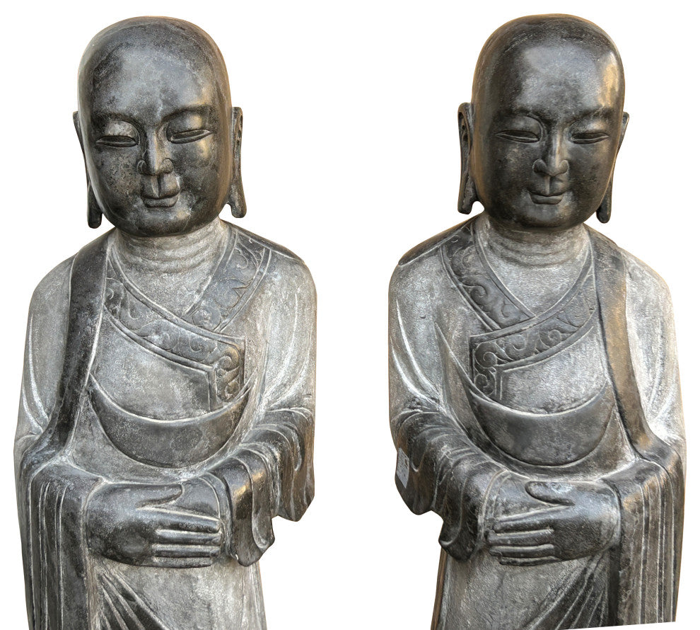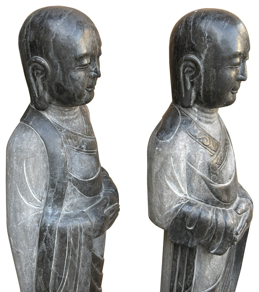 Infuse your space with spiritual serenity with this captivating pair of Black Gray Stone Carved Standing Monk Arhat Lohan Statues. These intricately carved figures, representing enlightened beings from Buddhist mythology, emanate a sense of peace and tranquility. The statues are meticulously crafted with detailed expressions and flowing robes, showcasing the artistry and spiritual devotion of ancient traditions. Whether placed in a meditation space, garden, or as a focal point in your home, these Arhat Lohan statues will inspire contemplation and create a serene atmosphere.Dimensions: w11" x d8" x h48" eachOrigin: ChinaMaterial: StoneCondition: hand carved, natural stone patina and marks, may have minor chips at the bottom due to movementUS domestic continental buyer of 48 states pays $600 shipping charge for curbside delivery. Customer from Hawaii, Alaska, US Island, Florida Keywest, and Canada pays extra shipping costs. Insurance and handling charges are already included in the shipping cost. In-store pick-up is highly welcomed if you are in San Francisco Bay Area. (No charge) White-Glove service can be arranged with an additional cost.For customer who is looking to buy multiple items. We can either combine "œseveral items on the same pallet "œor "œinclude small items inside the largest item as long as it fits in"�When your shipment is delivered, carefully inspect the outside of the packaging before the delivery personnel leave. It is important to clearly indicate if there is any visible damage to the packaging or items on the delivery paperwork. Carriers usually do not honor concealed damage claims so it is crucial to clearly indicate any visible damage to the packaging or items on the delivery paperwork