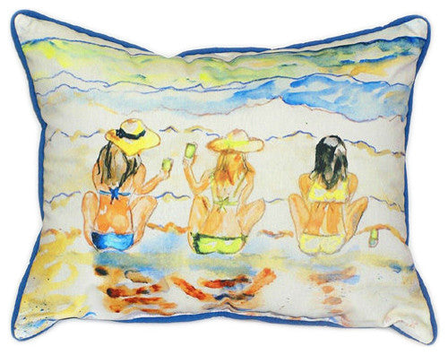 This magnificent pair of Bottoms Up print indoor / outdoor pillows are from Betsy Drake Interiors. Proudly made in the USA, each pillow features a wonderful watercolor print of 3 ladies sharing some cocktails at the beach, based on original artwork by artist Betsy Drake. Each pillow measures 16 inches tall, 20 inches long, has a 100% polyester cover, which resists fading and wear, giving you years of use, and is stuffed with polyester. Recommended care instructions are to spot clean, only.