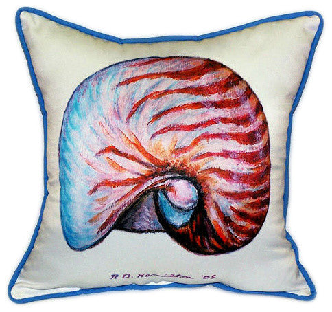 This gorgeous pair of Nautilus print indoor / outdoor pillows are from Betsy Drake Interiors. Proudly made in the USA, each pillow features a wonderful watercolor print of a colorful Nautilus shell, based on original artwork by artist R.B. Hamilton. Each pillow measures 18 inches tall, 18 inches long, has a 100% polyester cover, which resists fading and wear, giving you years of use, and is stuffed with polyester. Recommended care instructions are to spot clean, only.