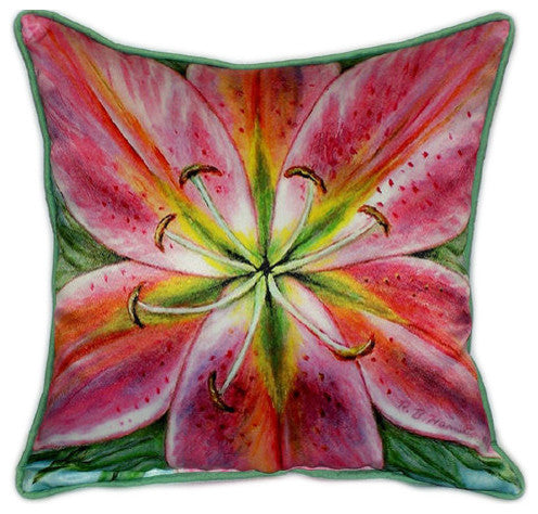 This beautiful pair of Pink Lily print indoor / outdoor pillows are from Betsy Drake Interiors. Proudly made in the USA, each pillow features a wonderful close-up print of a pink lily flower, based on original artwork by artist Betsy Drake. Each pillow measures 18 inches tall, 18 inches long, has a 100% polyester cover, which resists fading and wear, giving you years of use, and is stuffed with polyester. Recommended care instructions are to spot clean, only.