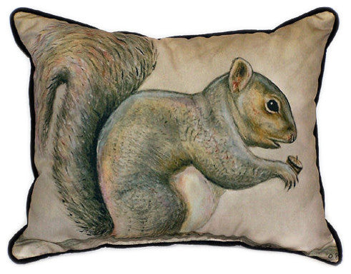 This wonderful pair of Squirrel print indoor / outdoor pillows are from Betsy Drake Interiors. Proudly made in the USA, each pillow features a wonderfully realistic print of a gray squirrel, based on original artwork by artist R.B. Hamilton. Each pillow measures 16 inches tall, 20 inches long, has a 100% polyester cover, which resists fading and wear, giving you years of use, and is stuffed with polyfill. Recommended care instructions are to spot clean, only.