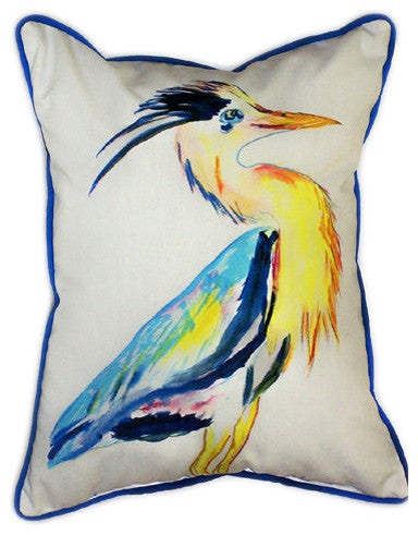 This stunning pair of Vertical Blue Heron print indoor / outdoor pillows are from Betsy Drake Interiors. Proudly made in the USA, each pillow features a wonderful watercolor print of a blue heron, based on original artwork by artist Betsy Drake. Each pillow measures 20 inches tall, 16 inches long, has a 100% polyester cover, which resists fading and wear, giving you years of use, and is stuffed with polyester. Recommended care instructions are to spot clean, only.