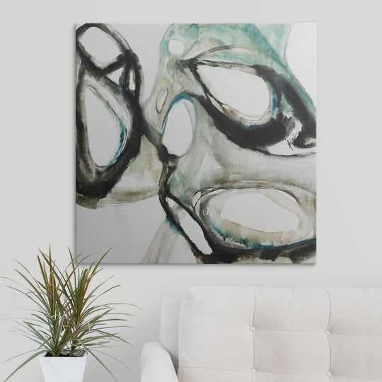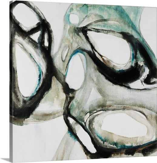 Gallery-wrapped canvas entitled, "Paleo IV".Abstract painting in contrasting neutral and cool tones of various rounded shapes that connect and intersect, on a solid light background.Our wrapped canvases feature a proprietary design that prevents warping or sagging over time. By using archival inks and artist-grade canvas, our premium canvases are sure to add that extra touch to any space. Lastly, our canvases are finished with a closed back that incorporates pre-installed hanging hardware for easy installation.