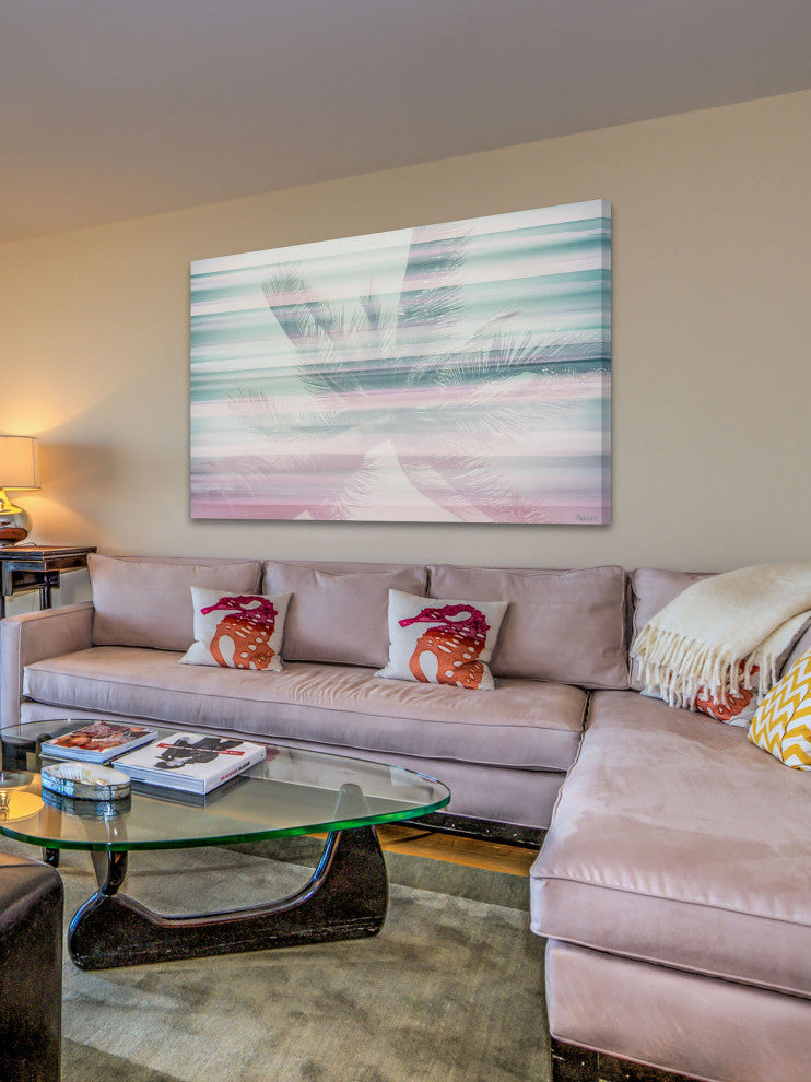 Striking and unique, the "Palm Leaves" Print on Canvas by Parvez Taj will bring your walls to life. Printed on canvas, this 36 inch wide by 24 inch tall contemporary artwork will make a statement in any living room, dining room, or bedroom.- Fine art canvas print by Parvez Taj- Professionally hand stretched- Gallery wrapped in sustainable, non-warping wood- Arrives ready to hang- Made in the USA- Includes a certificate of authenticity- Artist signature on the front