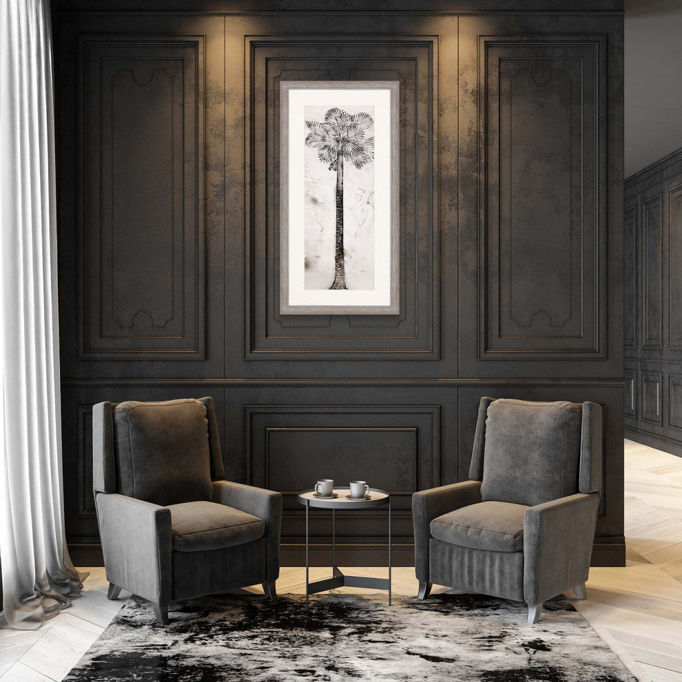 A stately palm is matted in white. Framed in a distressed silver finish moulding.