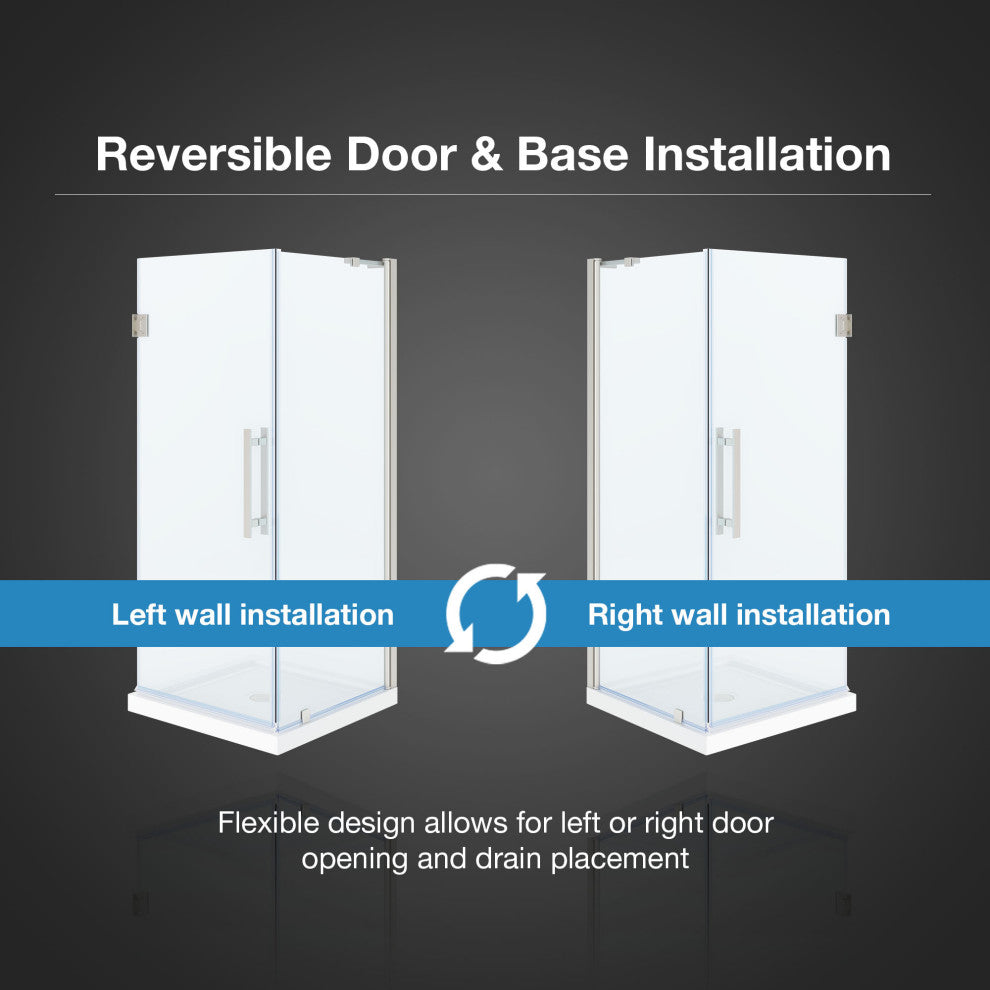 Frameless reversible door installation with built-in door magnet for a secure and tight close; no more leaks, no more wet floors
