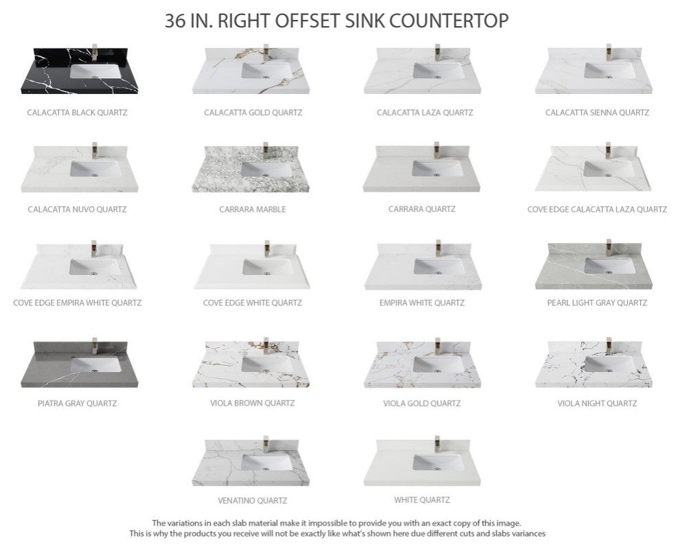 Willow Collection Paris 36 x 22 Right Offset Single Sink Bath Vanity in Blue Heather with 1.5" Straight/ Mitered Edge Empira QuartzThe Paris Collection is a stunning bathroom vanity that exudes artistry and quality craftsmanship. This premium vanity is made from solid Birch Wood and Plywood ( NO MDF and PRESSBOARD ) and features a dovetail joint that adds elegance to the contemporary design. You can choose between a single sink or double sink configuration to suit your needs, and the fluted side panels add more detail to the modern look. This vanity is sure to make a statement in any bathroom.FEATURES:1. Traditional style with a modern twist - made from Birch Wood and Plywood ( NO MDF and PRESSBOARD ), this bathroom vanity features a clean, contemporary design with soft-close hardware and antique brass hardware.2. Premium quartz or marble countertops - choose from a variety of colors to perfectly match your existing decor.3. Made from sustainable and eco-friendly Birch Wood and Plywood ( NO MDF and PRESSBOARD ), this product is a great way to provide your home with the comfort you deserve. The FSC certificate ensures that it meets strict environmental standards4. Plenty of storage space - this vanity comes with plenty of cabinet space to store all your bathroom essentials.5. Easy Carry - The cabinets are easy to carry because they come in 2 separate boxes. Countertop and cabinet, so you can just pick up the pieces without worrying about lifting heavy items!Details:Material: Birch Wood and Plywood ( NO MDF and PRESSBOARD )Finish Available: White, Fine Grain, Blue Heather and BlackNumber of Drawers: 3 Regular Drawers, 1 ShelfSink Installation: Under-mounted rectangle SINK(S)Hardware: Soft closing hinges and slider Hardware Finish: Brushed Gold FinishCabinet Width: 35 (in.)Cabinet Depth: 21-1/2 (in.)Countertop Width: 36 (in.) Countertop Depth: 22 (in.)Cabinet Height: 34 (in.)Countertop Height: 1.5 (in.) Double Cove Edge or 2 (in.) Straight/ Mitered EdgeCabinet Height with Top: 36 (in.)Backsplash Height: 4 (in.)Faucet: NOT IncludedFaucet Hole(S): Comes with SINGLE hole faucetVanity Countertops options: Mitered /Straight edge or Double Cove Edge (Pure White Quartz, Calacatta Laza Quartz, Calacatta Nuvo Quartz, Empira White Quartz, Carrara Marble, Carrara Quartz, Piatra Gray Quartz, Calacatta Black, Calacatta Gold, Venatino Quartz, Pearl Light Gray, Viola Brown, Viola Gold, Viola Night, Calacatta Sienna, 2" Calacatta Poanazzo, 3 CM Artic White)