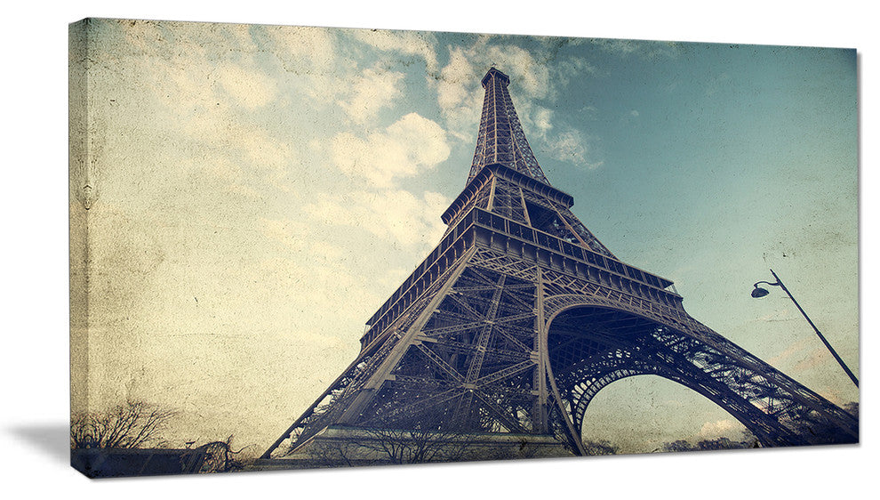 The Paris Eiffel Tower Vintage View from Ground canvas art print is sure to make an impression on anyone who sees it. This artwork is gallery wrapped around a 1-inch solid wood frame and arrives carefully packaged and entirely ready to hang on the wall. Design Art only uses the highest resolution and pigments to ensure a crisp colorful print that is never faded or pixelated. This artwork is sure to be a conversation starter in any home or office.