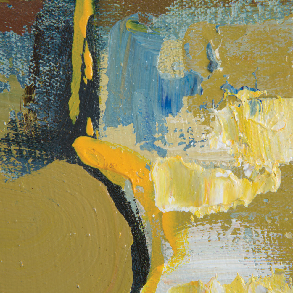 You don''t have to be a musicians to have an appreciation for music and the instruments that make it. This painting features a grand piano with spots of color in shades of tan, green, blue, mustard, and red. The background is varying shades of beige with stamped writing.