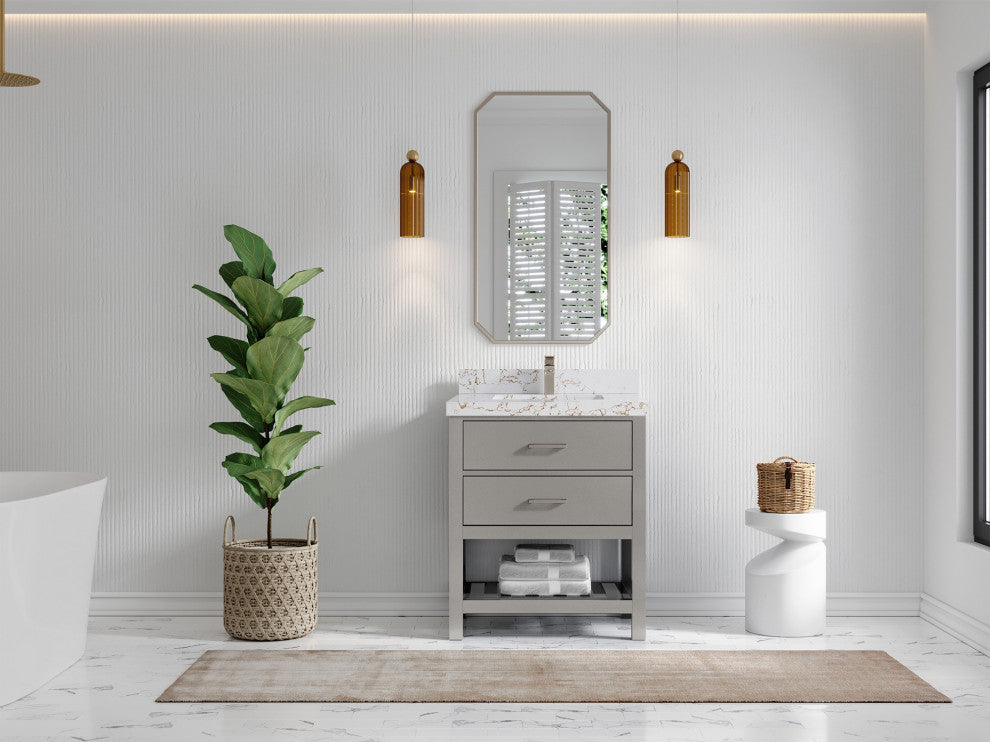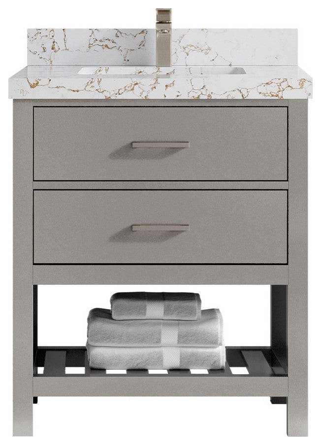 Willow Collection Parker 30 x 22 Single Sink Bath Vanity in Elephant Skin Gray with 2" Straight/ Mitered Edge Viola Gold QuartzThe Parker vanity is a beautiful and modern addition to any bathroom. The sleek, spare design is perfect for a fresh and modern decor, and the top-quality materials and construction are sure to impress. The soft closing doors are a nice touch, and the generous storage space is perfect for all of your bathroom essentials. Whether you�re looking for a new centerpiece for your master bathroom or a guest powder room, the Parker vanity is sure to impress. Thanks to its high-quality construction, beautiful design, and ample storage space, this vanity is sure to become a treasured part of your home for years to come.Details:Material: Birch Wood and Plywood (NO MDF or PRESSBOARD) Finish Available: Navy Blue, Elephant Skin Gray, Lafayette Green, WhiteNumber of Drawers: 2 Regular Drawers, 1 Bottom ShelfSink Installation: Under-mounted rectangle SINK(S)Hardware: Soft closing hinges and sliderHardware Finish : Brushed NickelCabinet Width: 29 (in.)Cabinet Depth: 21-1/2 (in.)Countertop Width: 30 (in.) Countertop Depth: 22 (in.)Cabinet Height: 34 (in.)Countertop Height: 1.5 (in.) Double Cove Edge or 2 (in.) Straight/ Mitered EdgeCabinet Height with Top: 36 (in.)Backsplash Height: 4 (in.)Faucet: NOT IncludedFaucet Hole(S): Comes with SINGLE hole faucetVanity Countertops options: Mitered /Straight edge or Double Cove Edge (White Quartz, Calacatta Laza Quartz, Calacatta Nuvo Quartz, Carrara Quartz, Empira Quartz, Carrara Marble, Piatra Gray Quartz, Pearl Light Gray Quartz, Venatino Quartz, Calacatta Gold Quartz, Calacatta Black Quartz, Calacatta Nuvo Quartz)