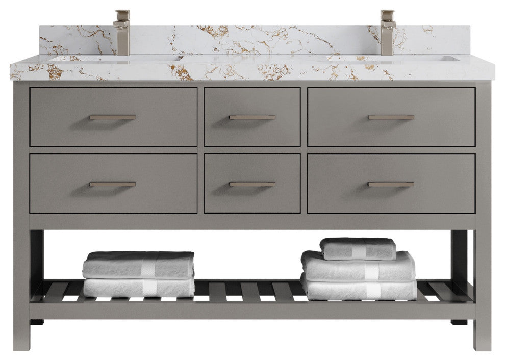Willow Collection Parker 60 x 22 Double Sink Bath Vanity in Elephant Skin Gray with 2" Straight/ Mitered Edge Viola Gold QuartzThe Parker vanity is a beautiful and modern addition to any bathroom. The sleek, spare design is perfect for a fresh and modern decor, and the top-quality materials and construction are sure to impress. The soft closing doors are a nice touch, and the generous storage space is perfect for all of your bathroom essentials. Whether you�re looking for a new centerpiece for your master bathroom or a guest powder room, the Parker vanity is sure to impress. Thanks to its high-quality construction, beautiful design, and ample storage space, this vanity is sure to become a treasured part of your home for years to come.Details:Material: Birch Wood and Plywood (NO MDF or PRESSBOARD) Finish Available: Navy Blue, Elephant Skin Gray, Lafayette Green, WhiteNumber of Drawers: 6 Regular Drawers, 1 Bottom ShelfSink Installation: Under-mounted rectangle SINK(S)Hardware: Soft closing hinges and sliderHardware Finish : Brushed NickelCabinet Width: 59 (in.)Cabinet Depth: 21-1/2 (in.)Countertop Width: 60 (in.) Countertop Depth: 22 (in.)Cabinet Height: 34 (in.)Countertop Height: 1.5 (in.) Double Cove Edge or 2 (in.) Straight/ Mitered EdgeCabinet Height with Top: 36 (in.)Backsplash Height: 4 (in.)Faucet: NOT IncludedFaucet Hole(S): Comes with SINGLE hole faucetVanity Countertops options: Mitered /Straight edge or Double Cove Edge (White Quartz, Calacatta Laza Quartz, Calacatta Nuvo Quartz, Carrara Quartz, Empira Quartz, Carrara Marble, Piatra Gray Quartz, Pearl Light Gray Quartz, Venatino Quartz, Calacatta Gold Quartz, Calacatta Black Quartz, Calacatta Nuvo Quartz)