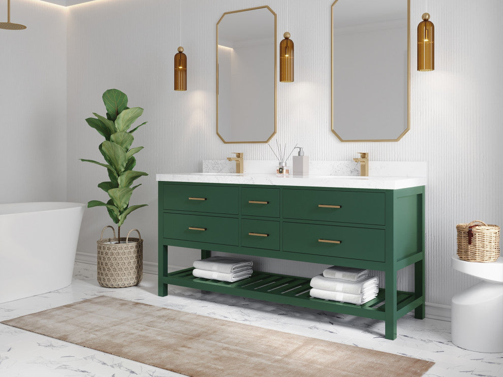Willow Collection Parker 72 x 22 Double Sink Bath Vanity in Lafayette Green with 2" Straight/ Mitered Edge Viola Brown QuartzThe Parker vanity is a beautiful and modern addition to any bathroom. The sleek, spare design is perfect for a fresh and modern d�acor, and the top-quality materials and construction are sure to impress. The soft closing doors are a nice touch, and the generous storage space is perfect for all of your bathroom essentials. Whether you''re looking for a new centerpiece for your master bathroom or a guest powder room, the Parker vanity is sure to impress. Thanks to its high-quality construction, beautiful design, and ample storage space, this vanity is sure to become a treasured part of your home for years to come.Details:Material: Birch Wood and Plywood (NO MDF or PRESSBOARD) Finish Available: Navy Blue, Elephant Skin Gray, Lafayette Green, WhiteNumber of Drawers: 6 Regular Drawers, 1 Bottom ShelfSink Installation: Under-mounted rectangle SINK(S)Hardware: Soft closing hinges and sliderHardware Finish : GoldCabinet Width: 71 (in.)Cabinet Depth: 21-1/2 (in.)Countertop Width: 72 (in.) Countertop Depth: 22 (in.)Cabinet Height: 34 (in.)Countertop Height: 1.5 (in.) Double Cove Edge or 2 (in.) Straight/ Mitered EdgeCabinet Height with Top: 36 (in.)Backsplash Height: 4 (in.)Faucet: NOT IncludedFaucet Hole(S): Comes with SINGLE hole faucetVanity Countertops options: Mitered /Straight edge or Double Cove Edge (White Quartz, Calacatta Laza Quartz, Calacatta Nuvo Quartz, Carrara Quartz, Empira Quartz, Carrara Marble, Piatra Gray Quartz, Pearl Light Gray Quartz, Venatino Quartz, Calacatta Gold Quartz, Calacatta Black Quartz, Calacatta Nuvo Quartz)