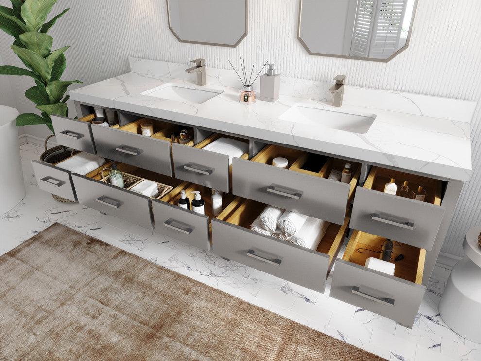 Willow Collection Parker 84 x 22 Double Sink Bath Vanity in Elephant Skin Gray with 2" Straight/ Mitered Edge Viola Night QuartzThe Parker vanity is a beautiful and modern addition to any bathroom. The sleek, spare design is perfect for a fresh and modern decor, and the top-quality materials and construction are sure to impress. The soft closing doors are a nice touch, and the generous storage space is perfect for all of your bathroom essentials. Whether you''re looking for a new centerpiece for your master bathroom or a guest powder room, the Parker vanity is sure to impress. Thanks to its high-quality construction, beautiful design, and ample storage space, this vanity is sure to become a treasured part of your home for years to come.Details:Material: Birch Wood and Plywood (NO MDF or PRESSBOARD) Finish Available: Navy Blue, Elephant Skin Gray, Lafayette Green, White, Evergreen and BlackNumber of Drawers: 10 Regular Drawers, 1 Bottom ShelfSink Installation: Under-mounted rectangle SINK(S)Hardware: Soft closing hinges and sliderHardware Finish : GoldCabinet Width: 83 (in.)Cabinet Depth: 21-1/2 (in.)Countertop Width: 84 (in.) Countertop Depth: 22 (in.)Cabinet Height: 34 (in.)Countertop Height: 1.5 (in.) Double Cove Edge or 2 (in.) Straight/ Mitered EdgeCabinet Height with Top: 36 (in.)Backsplash Height: 4 (in.)Faucet: NOT IncludedFaucet Hole(S): Comes with SINGLE hole faucetVanity Countertops options: Mitered /Straight edge or Double Cove Edge (White Quartz, Calacatta Laza Quartz, Calacatta Nuvo Quartz, Carrara Quartz, Empira Quartz, Carrara Marble, Piatra Gray Quartz, Pearl Light Gray Quartz, Venatino Quartz, Calacatta Gold Quartz, Calacatta Black Quartz, Calacatta Nuvo Quartz)