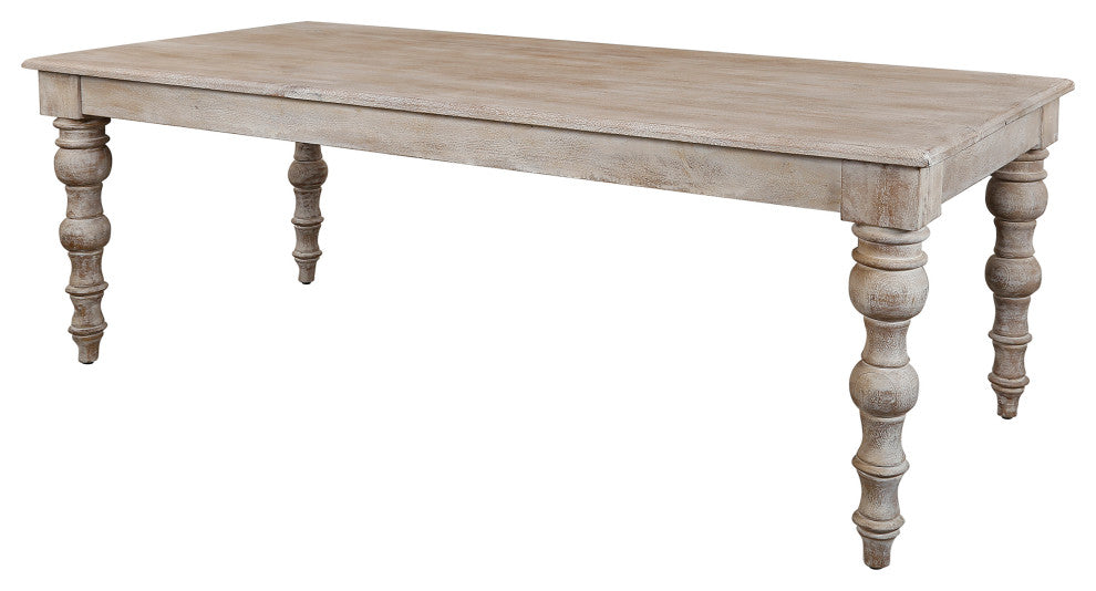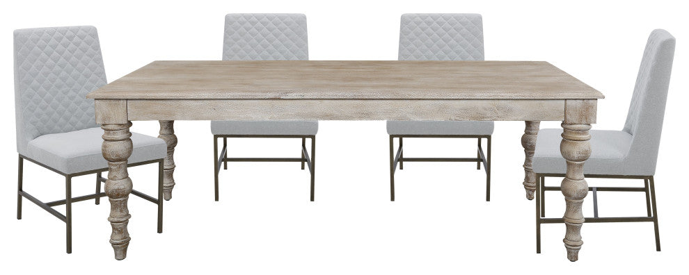 Crafted from solid mango, this table boasts a unique aesthetic with natural variations of color, wood grain, and knots, making each piece one-of-a-kind. Generously proportioned, this table can comfortably seat up to eight guests, making it the perfect centerpiece for your next dinner party. The shaped table with finished edge is complemented by a wide apron and shapely legs, creating a beautiful and functional piece of furniture. Reinforced table supports underneath provide additional support and stability, ensuring that this table will last for years to come. The wood is kiln-dried to minimize warping and splitting, ensuring that your table will remain level and stable. Integrated levelers make it easy to level and align your furniture, making it the perfect addition to any home. Experience the perfect blend of form and function with the 84 Inch Rectangular Table.Features:• Crafted from solid mango for a unique aesthetic with natural variations of color, wood grain and knots• Generously proportioned to comfortably seat up to eight guests• Shaped table with finished edge is complemented by a wide apron and shapely legs for classic charm• Reinforced table supports underneath provide additional support and stability• Wood is kiln-dried to minimize warping and splitting while ensuring longevity• Integrated levelers make it easy to level and align your furniture• Chair Upholstered in a polyester velvet fabric designed for elegant everyday living• Seat and back feature webbed construction for a comfortable seating experience• Exquisitely tailored tight seat features plush padding for long-lasting comfort• Quilted back and slightly tapered silhouette• Elegant diamond quilt pattern adds eye-catching allure to upholstered dining chair• Dimensions:• Rectangular Dining Table: 84"W x 38"D x 30"H - 126lbs.• Elise Linen Dining Chair: 23"W x 26"D x 39"H - 22.4lbs.• Seat Height - Floor to Seat: 19.5"• Seat Width - Side to Side: 21.5"• Seat Depth- Side to Side: 18"• Back Height - Seat to Top of Back: 21"• Leg Height - Top to Bottom: 15"• Back Width: 18"